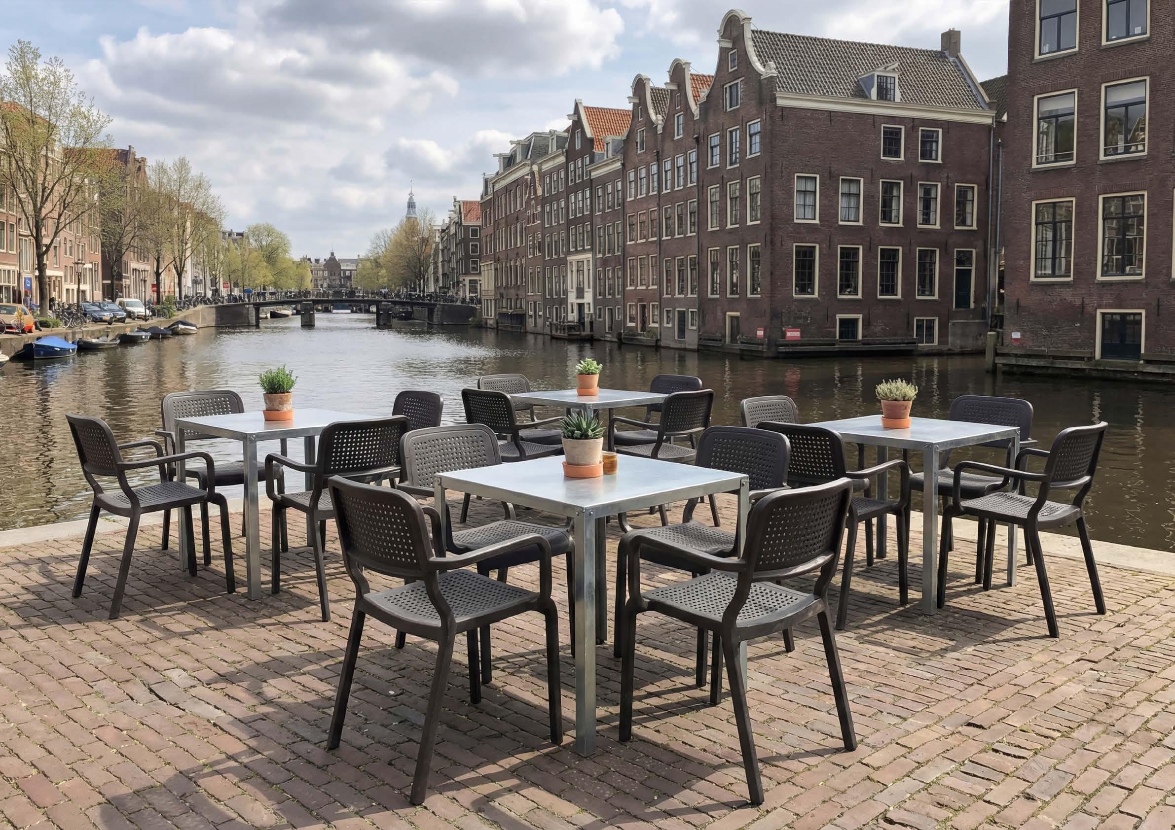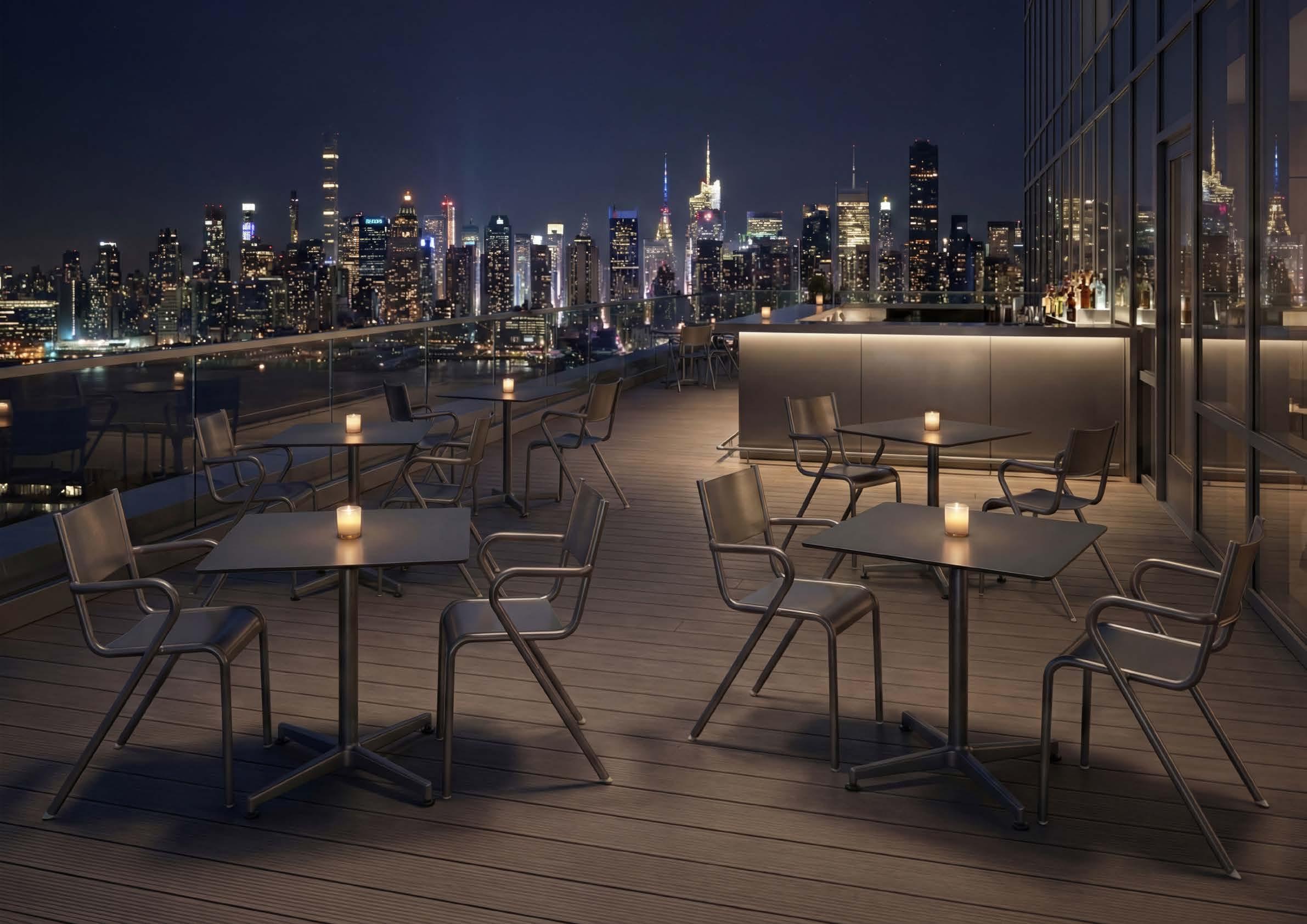The Hope Plus Alto table showcases a contemporary industrial style with pure materials and bold lines. Paired with Nelson stools, it forms a distinctive ensemble with a sleek presence and strong character.