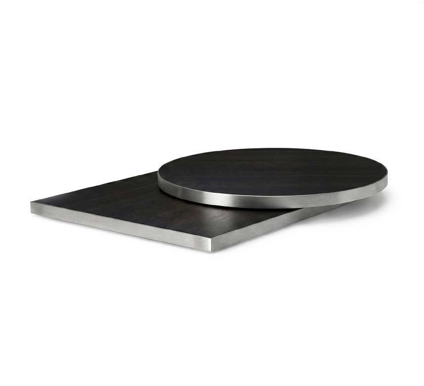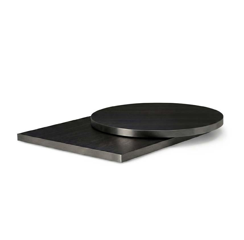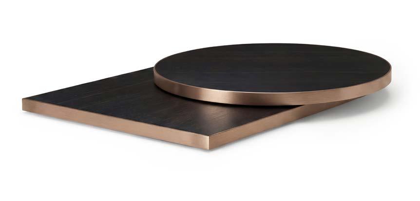 Piano nobilitato con anima in MDF che unisce solidità e raffinatezza. Bordo con finitura metallica disponibile in oro, inox, acciaio bruno, ottone anticato e rame: un dettaglio luminoso che dona eleganza a ogni spazio.