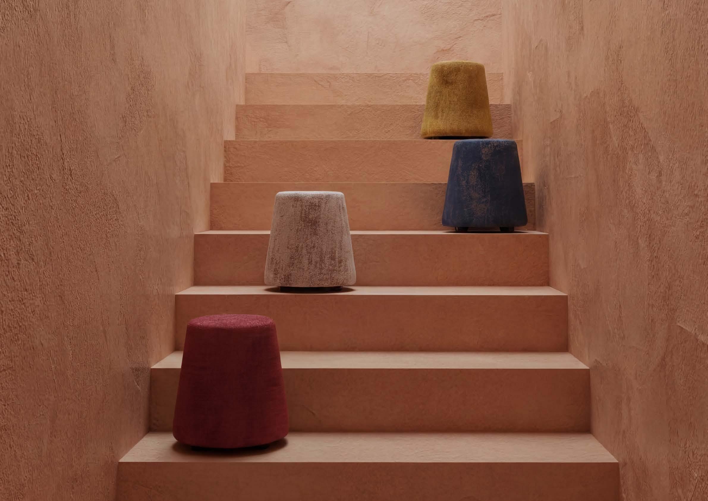Paired with Shabby stools, it creates a dialogue between shapes and materials.
