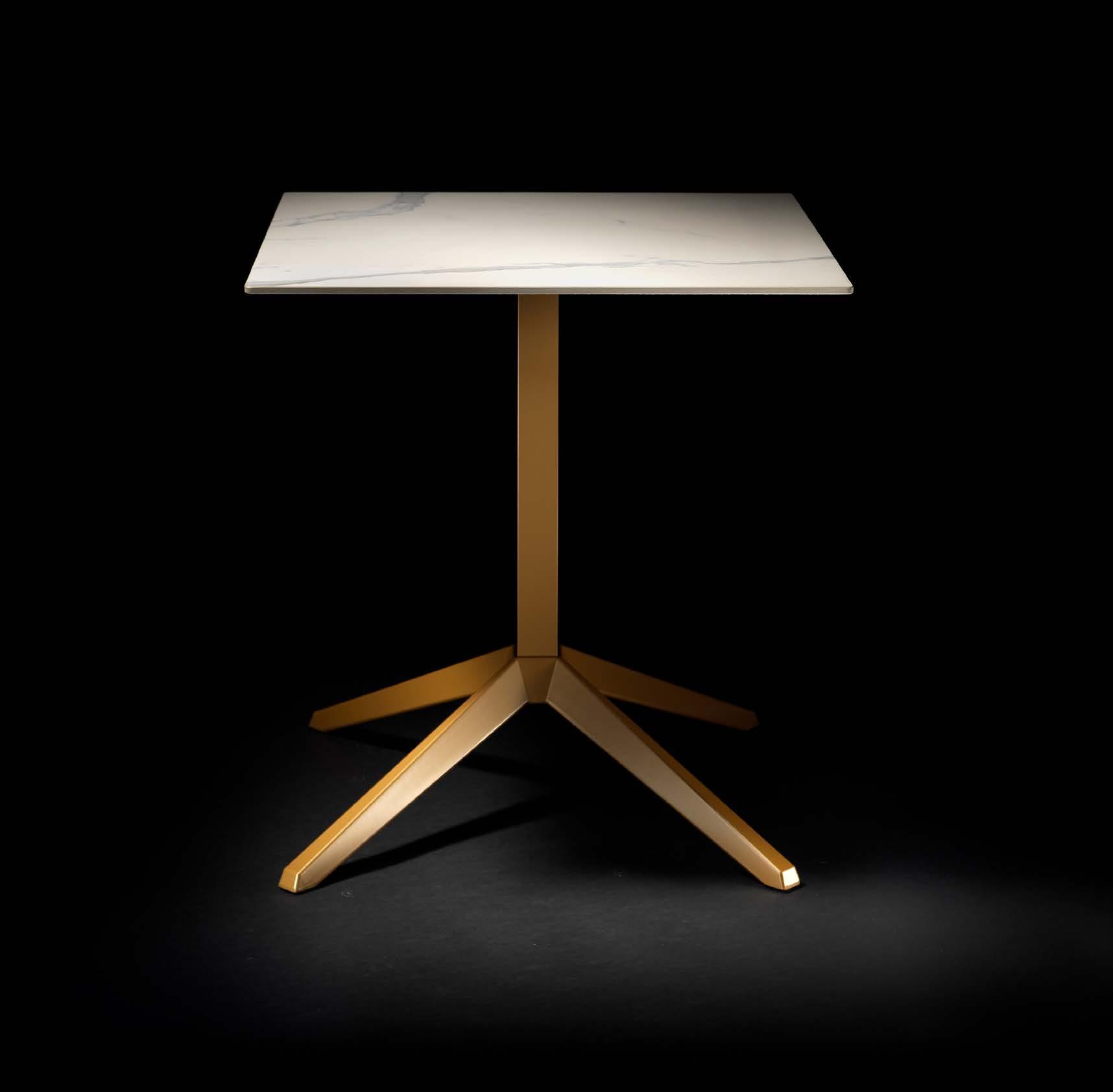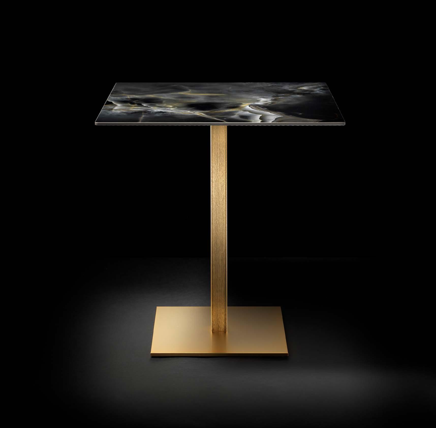 The 500q table combines a goldfinished base with a polished Onice Reale ceramic top, creating a piece that draws the eye and elevates any space.