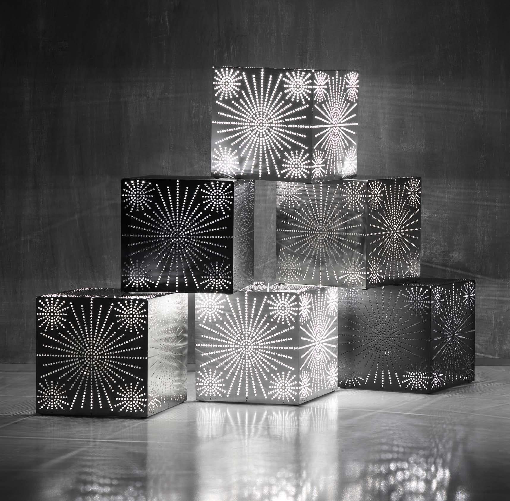 Balù, con i suoi 3672 micro-fori ottenuti a punzone, illumina lo spazio con eleganza. Pouf, tavolino o lampada, si trasforma in un protagonista capace di creare atmosfere sorprendenti.