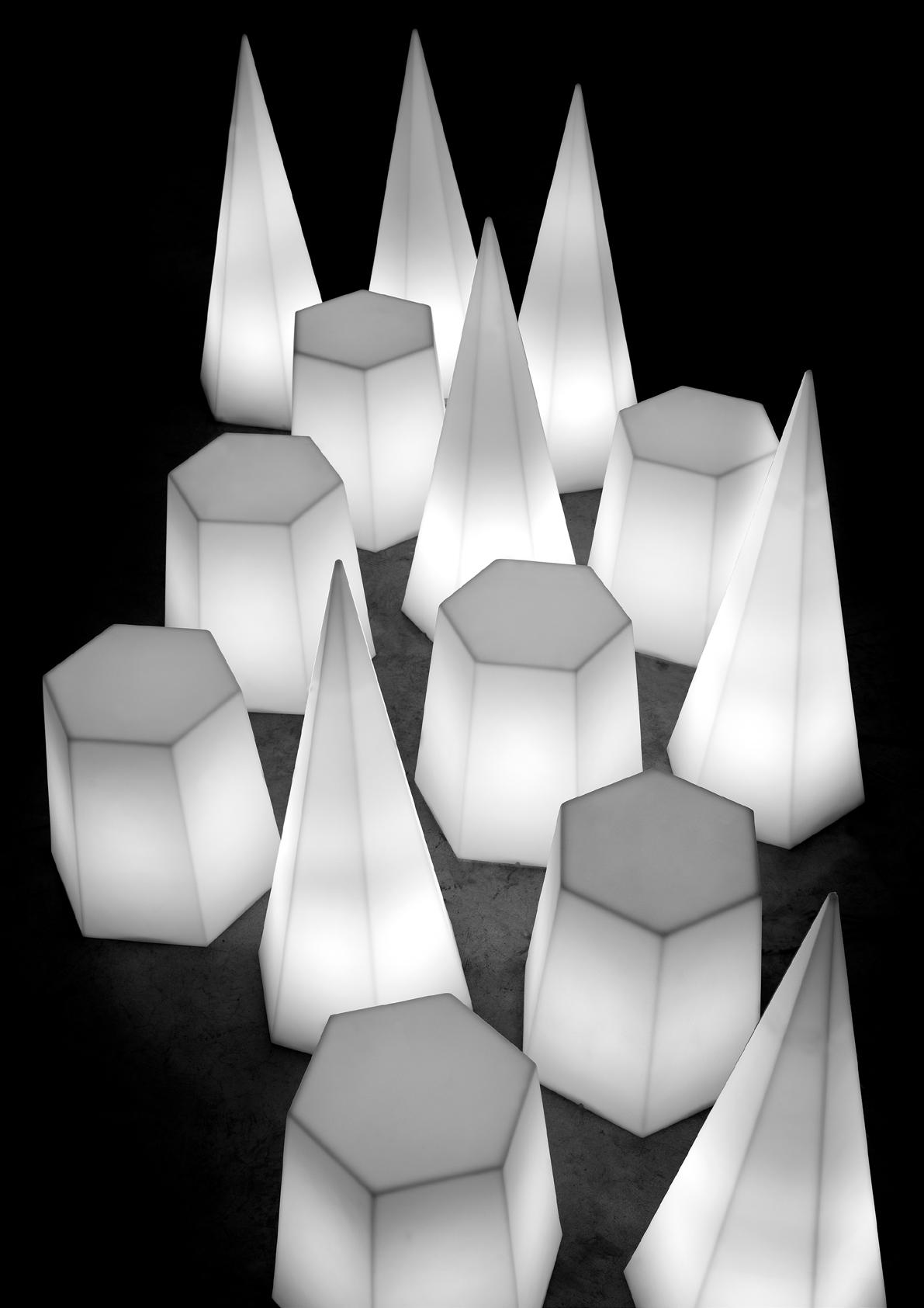 Diamante and Flash, made of polyethylene, transform light into sculpture, creating captivating atmospheres. Their pure forms and durable materials make them ideal for modern indoor and outdoor spaces.