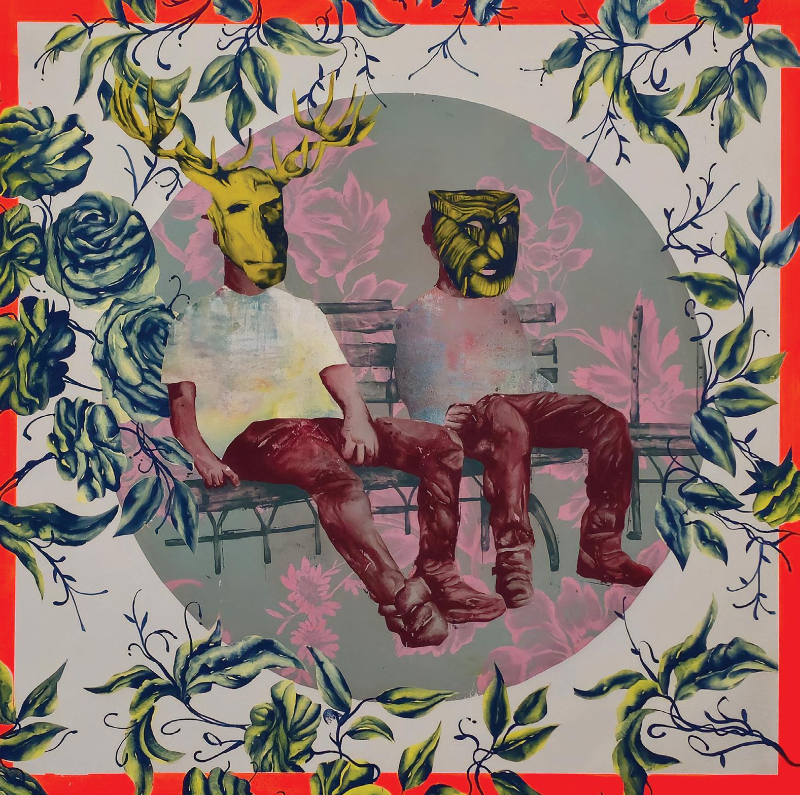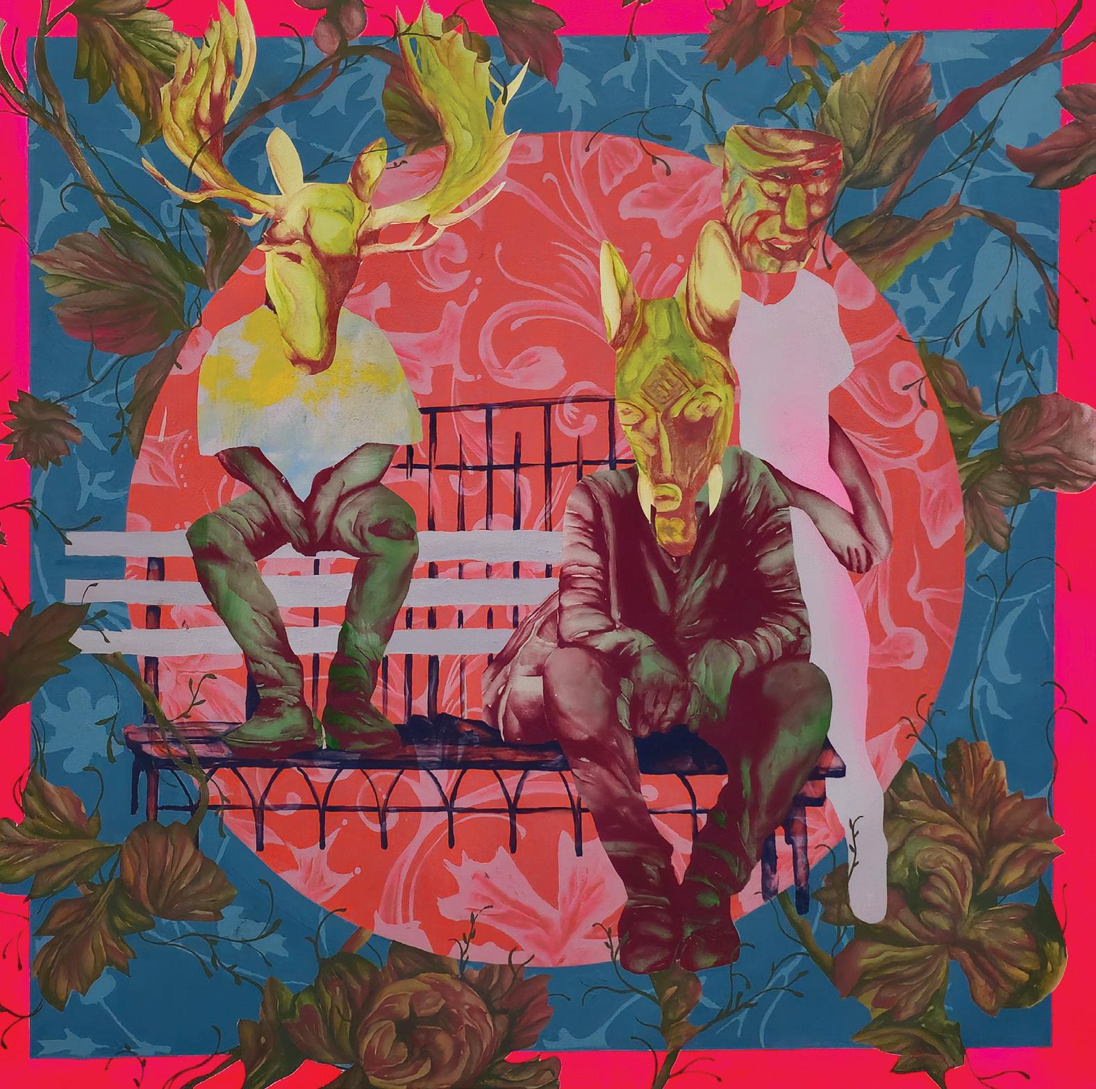 Similar frames and flowers appear in other works too, such as goliath and senora sola. In goliath, an upright masculine figure seems to float and sway, marionette-like, enveloped in a dark magenta floral background. A portion of a blue collar sits in contrast to a more prominent pink pleated bodice, paired with work pants and boots. A tall tribal-like mask stares out at the viewer. Senora sola’s feminine subject slouches in a chair, hands in the pockets of a vaguely Victorian red jacket, with head and shoulders balancing a broad sculptural adornment. Here, the face is not what one might recognize as a mask, but the expression is equally impenetrable. Arched eyebrows, heavy eyelids, and a sideways gaze prevent direct eye contact, a coordinated effort that acts as its own form of disguise. In bus stop, a pair of masculine figures sit casually on a bench, seemingly in their own respective worlds, masquerading as a deer or elk, bear or tiger.