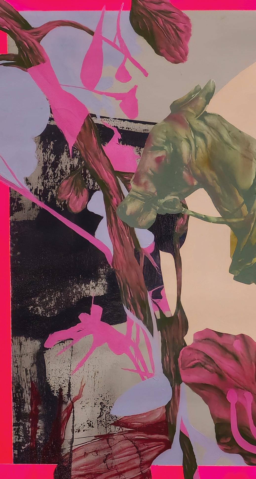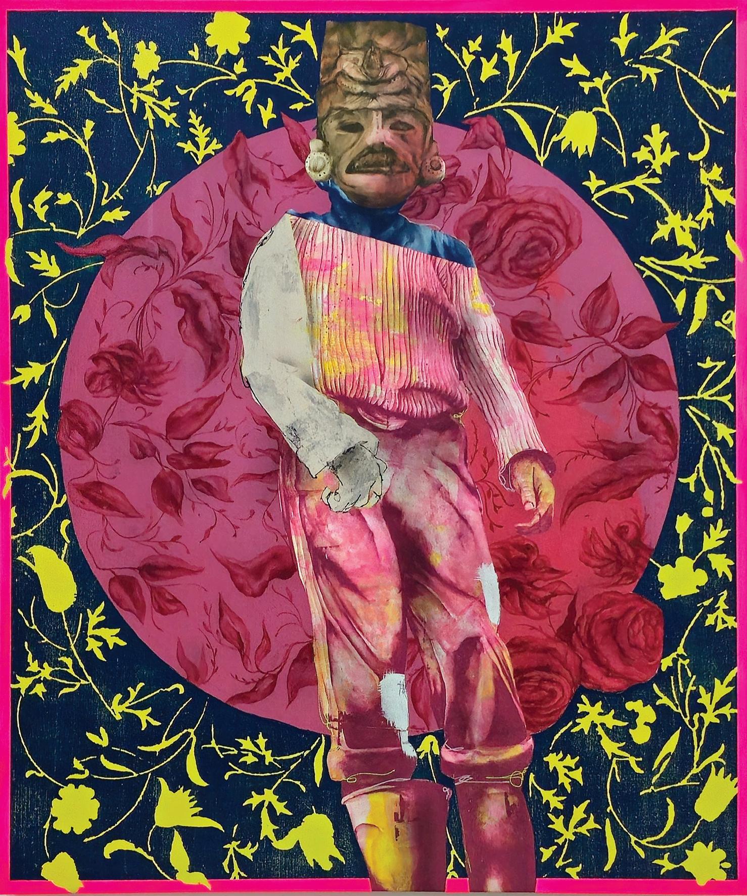 The new series of paintings Moncho created for Masks embodies a spirit of recontextualization, expanding ideas and building on elements present in his previous paintings, murals, and other forms of street art, compositions he has described as “opposing visual images that can create a new conversation.”