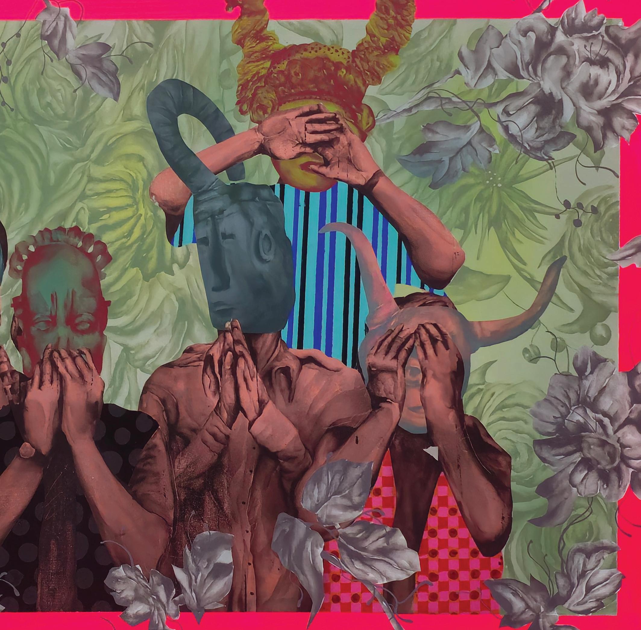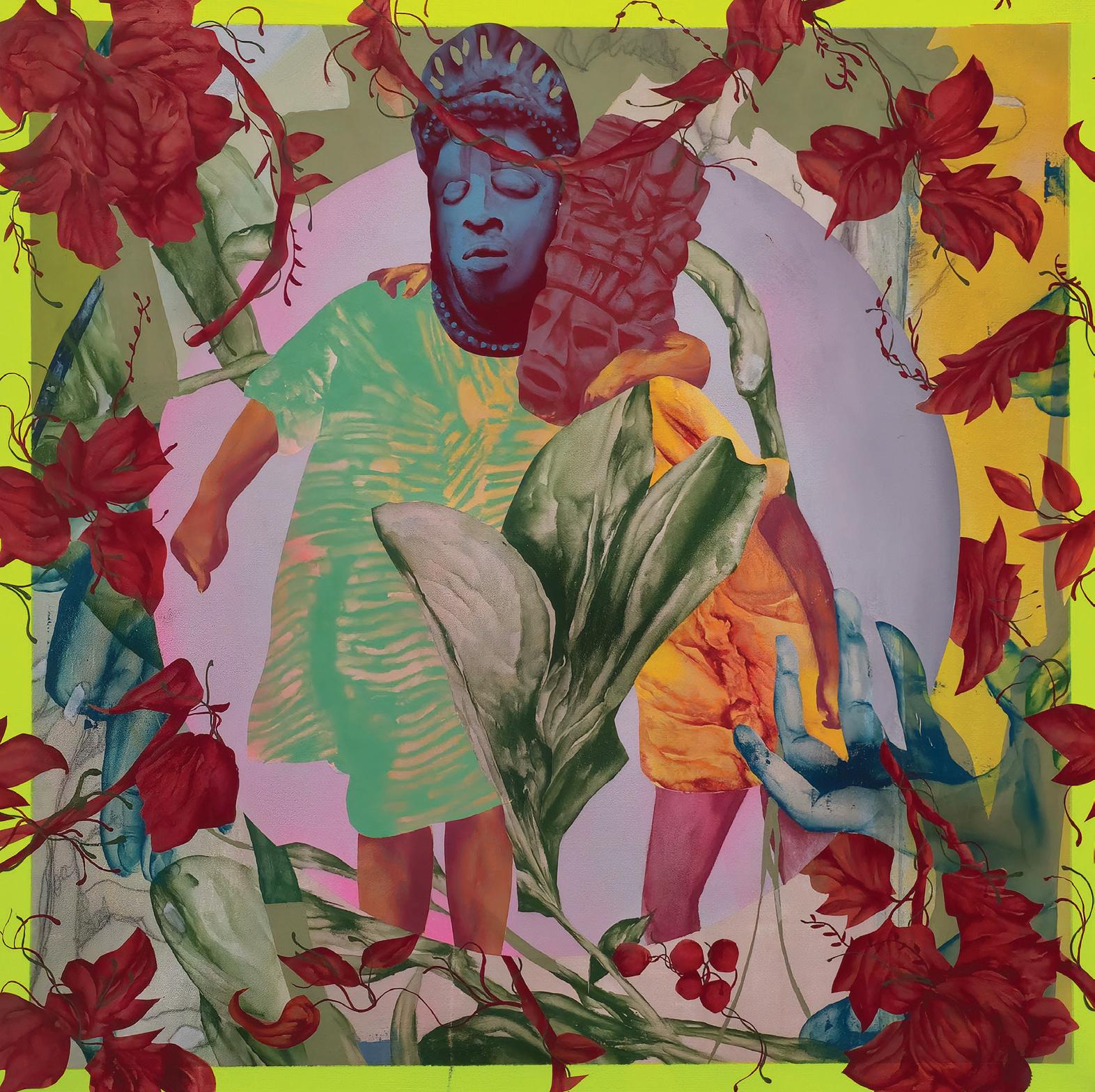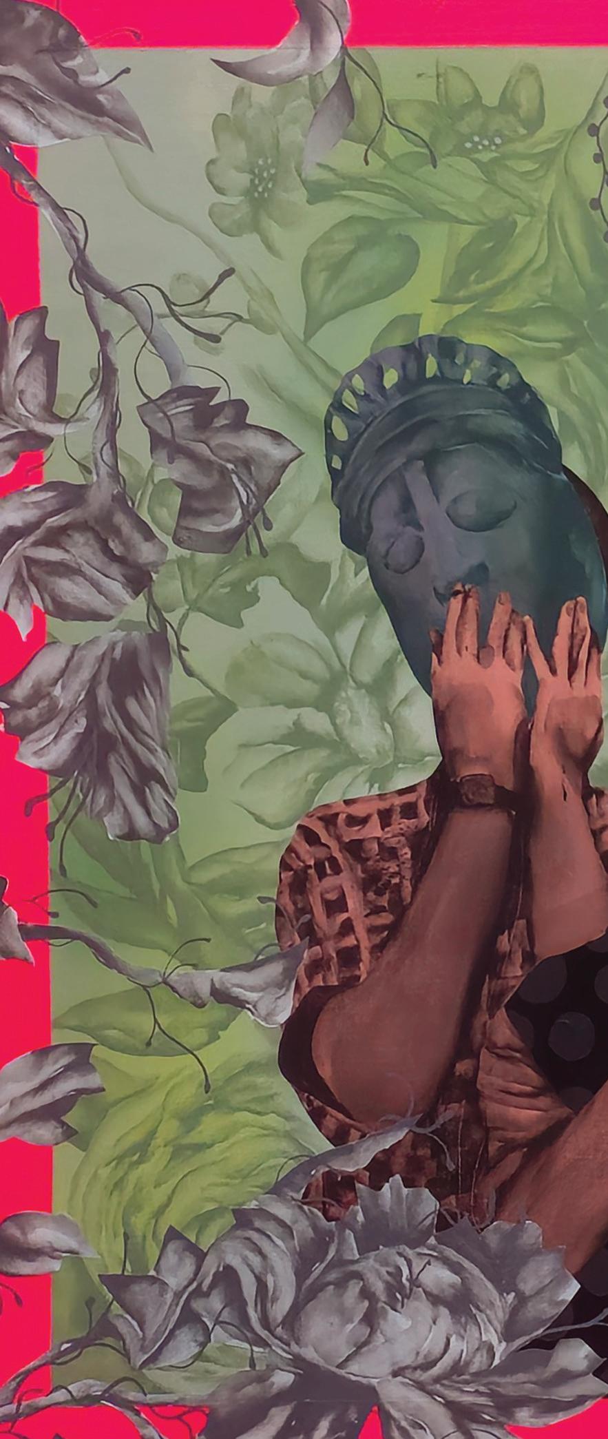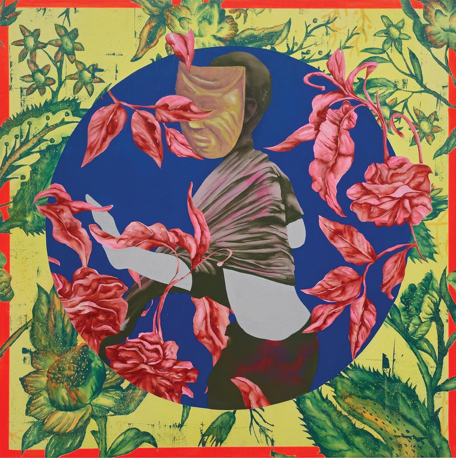 mask, hovers in front of the face and is itself obscured by a vibrant pinkish-red flowering vine. The scene, set against a royal blue background, is encircled by a bright yellow square populated with green flowers, all of which are framed by a fluorescent orange border. The combination of geometric and organic elements creates tension between feeling embraced and entrapped.