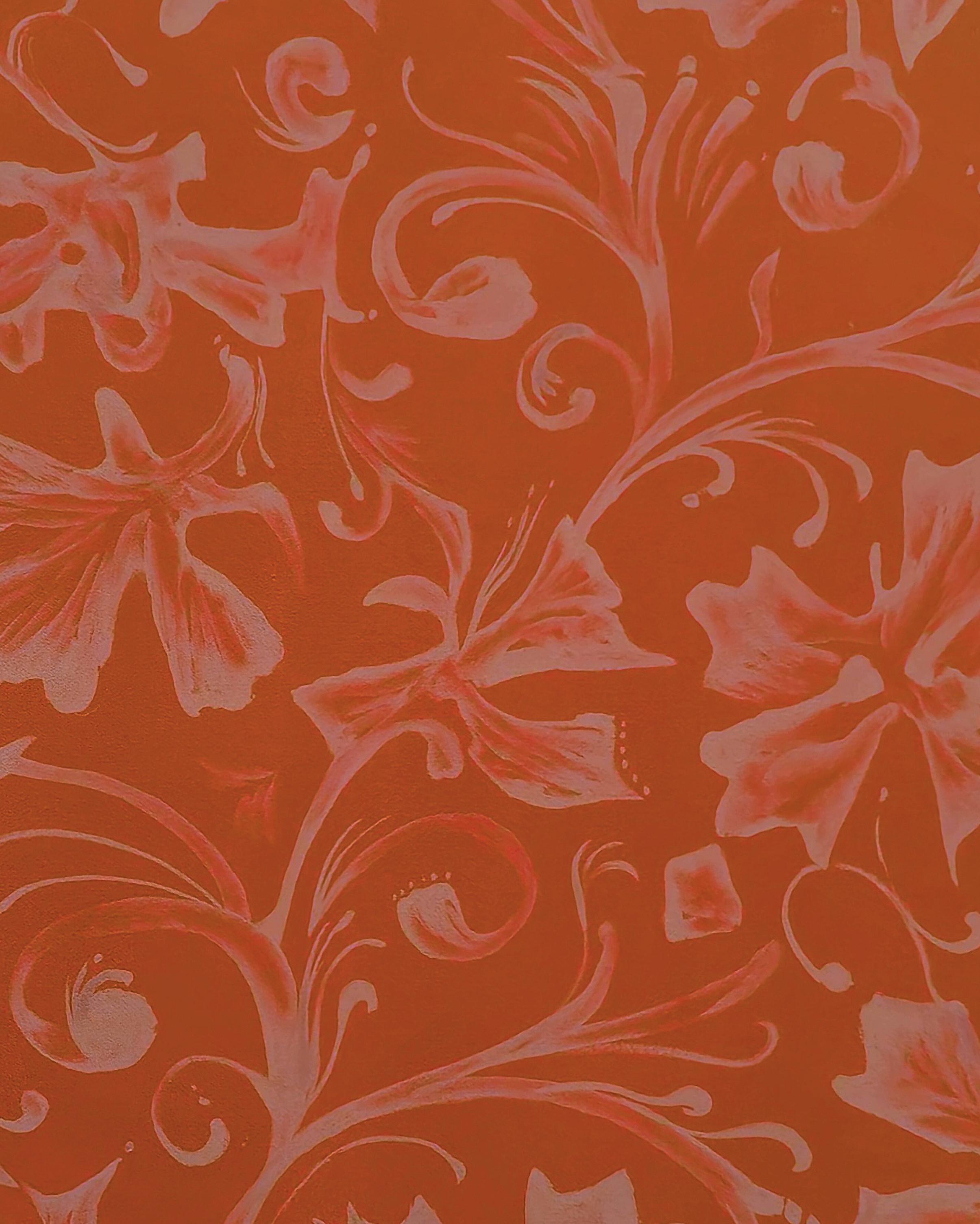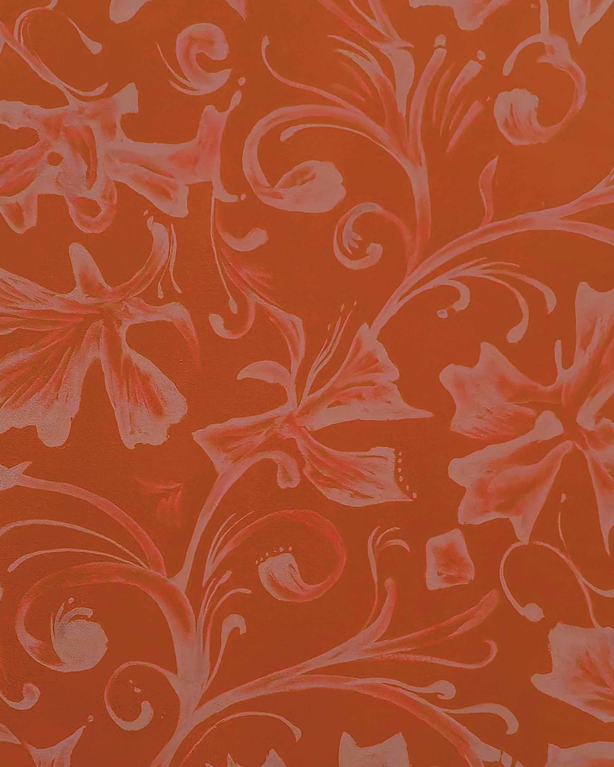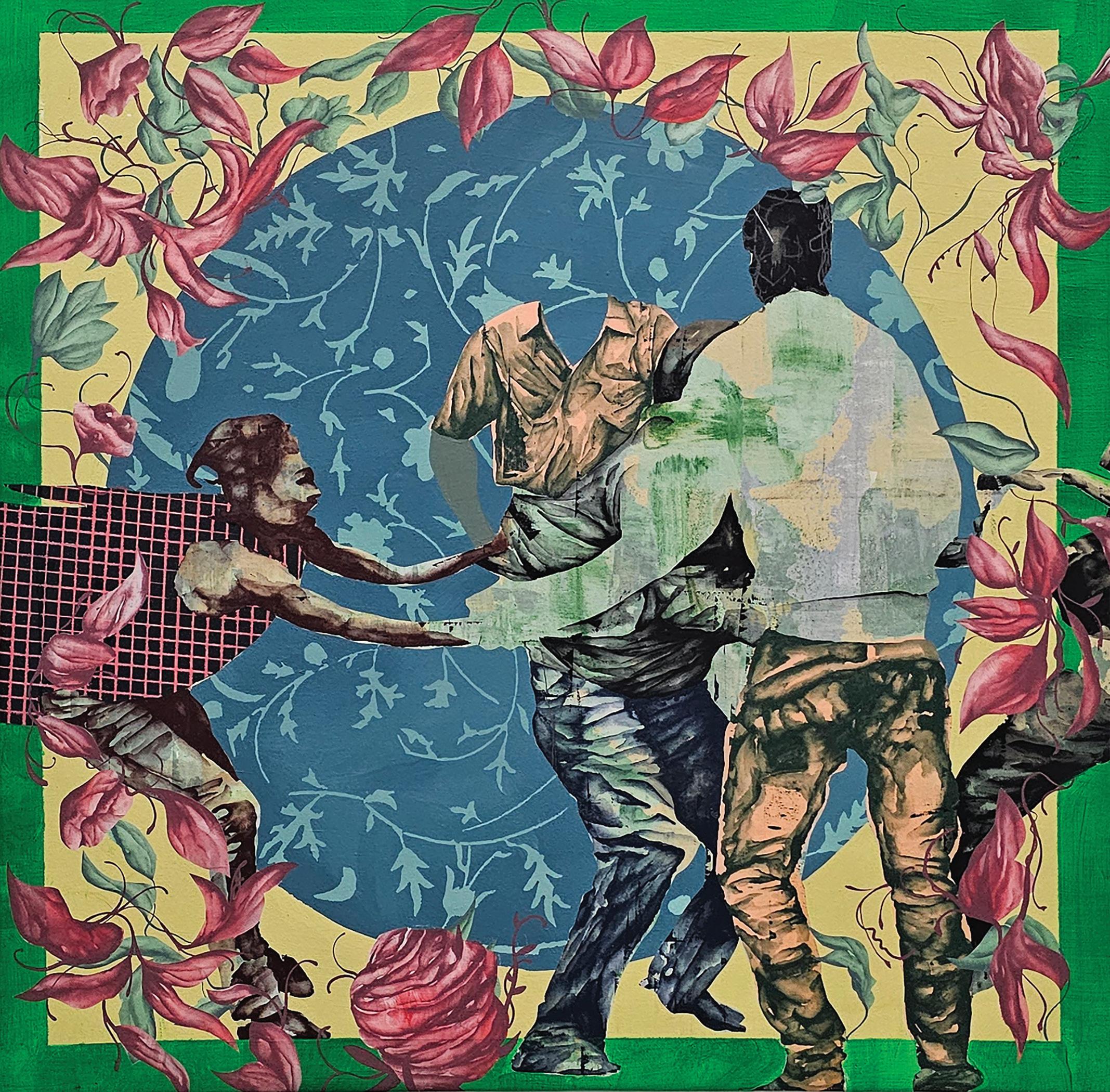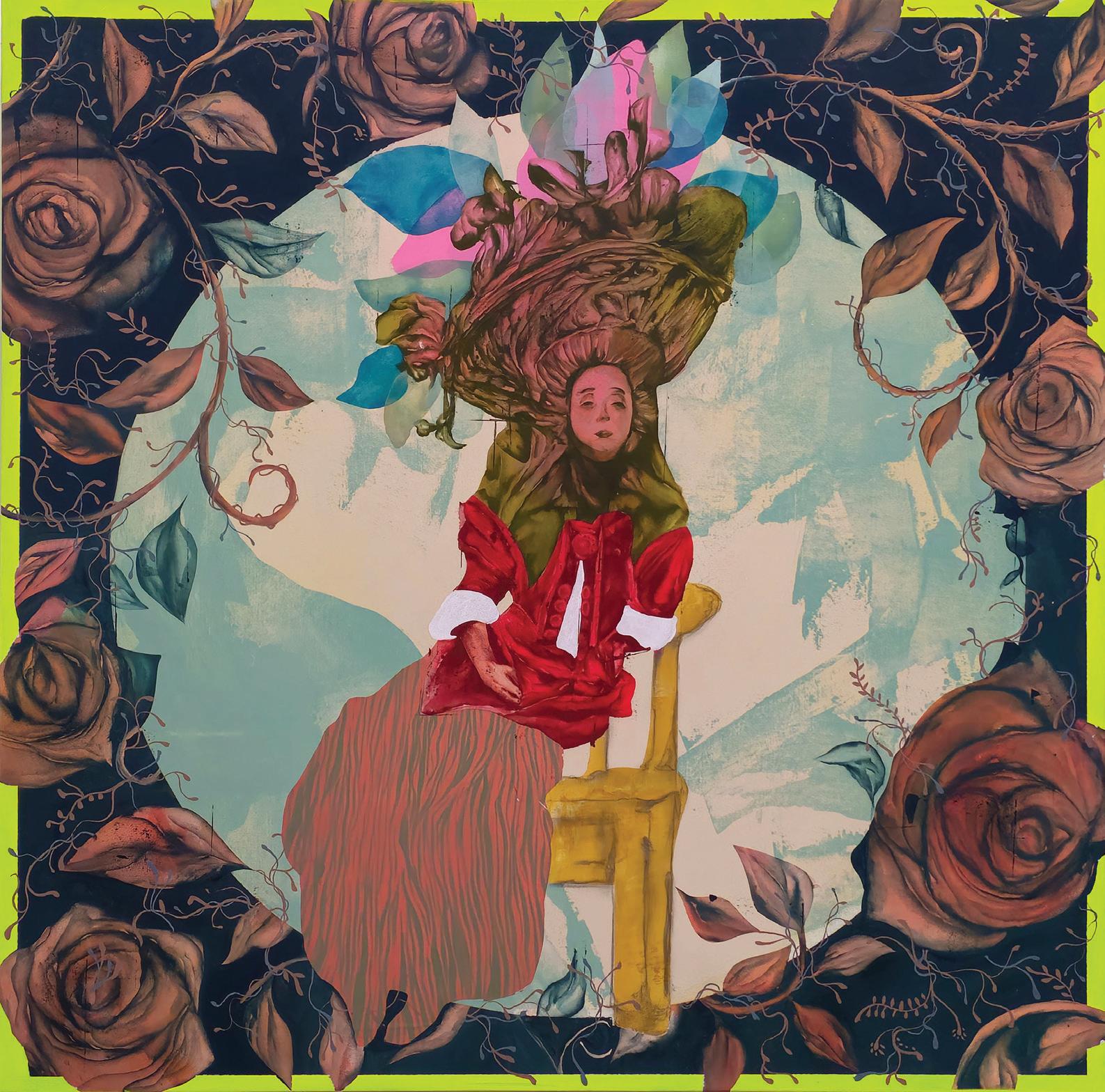 mask, hovers in front of the face and is itself obscured by a vibrant pinkish-red flowering vine. The scene, set against a royal blue background, is encircled by a bright yellow square populated with green flowers, all of which are framed by a fluorescent orange border. The combination of geometric and organic elements creates tension between feeling embraced and entrapped.
