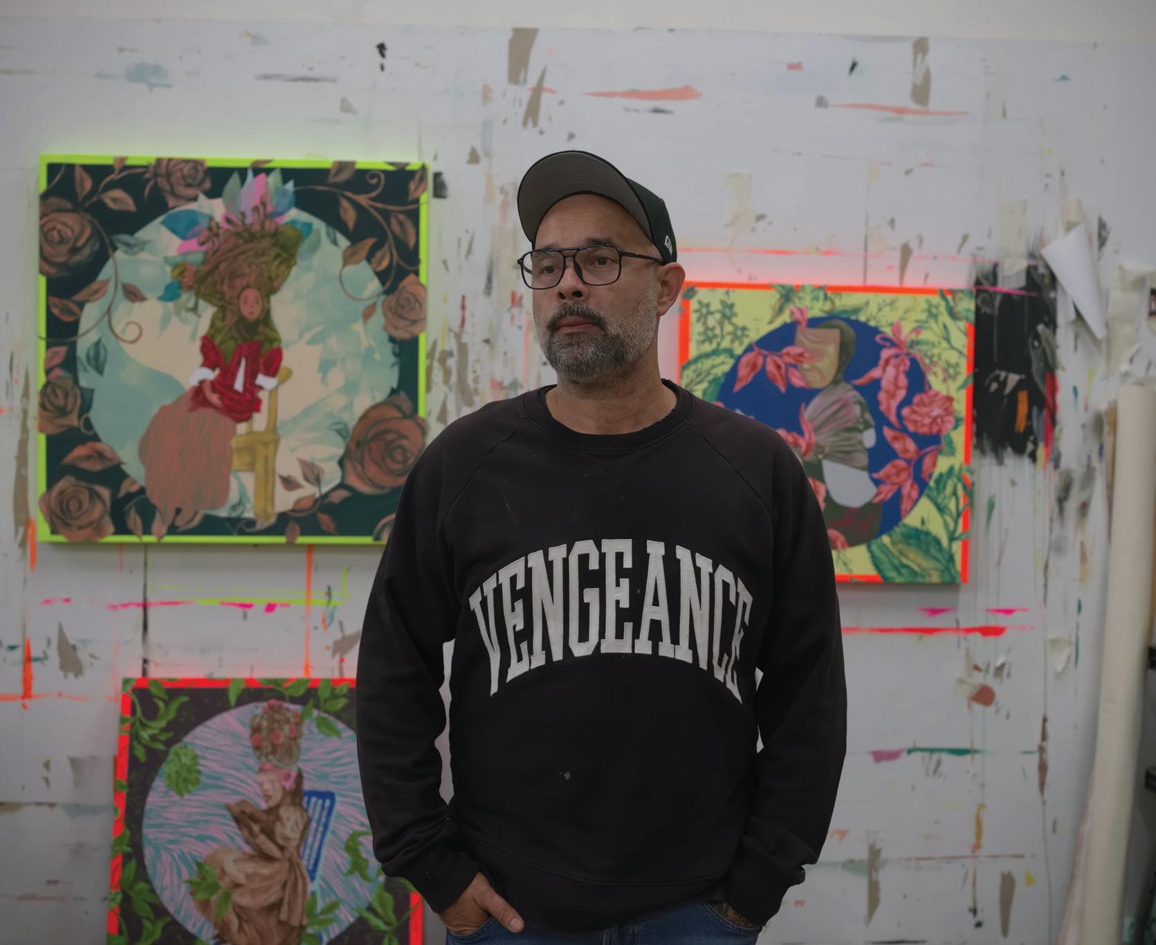 In each painting, Moncho strikes a balance between dynamic expression and strict technical skill, a handling that allows his works to breathe and layered stories to emerge. His images feel reciprocal, relational—an energy that is rooted in the graffiti and street art scene of New York City in the 1970s and ʼ80s, which Moncho experienced during his formative years. Street art became a powerful gateway to the life he envisioned for himself as an artist. He tells me, “When I used to walk around Canal Street with my mom, I would see galleries and it was always like, ‘That’s not for us.’ So, making street art was me wanting art to be accessible for people who didn’t feel like they could be in a gallery, who didn’t feel like they belong in that space, because galleries are a little bit exclusionary. And I remember telling her, ‘One day I’m going to be in one of those and belong there.’”