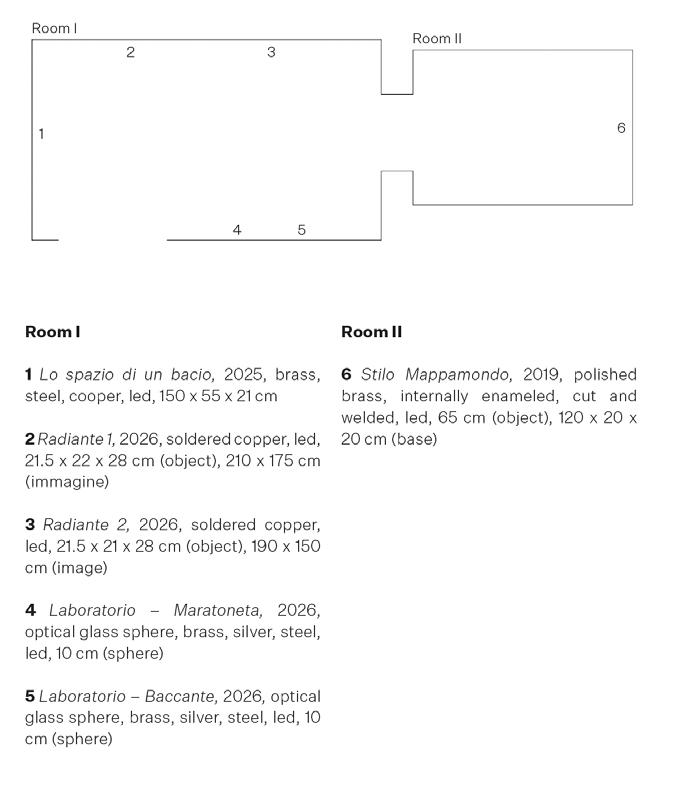 His works emerge as unpredictable luminous revelations from three-dimensional objects such as copper and brass prisms, or even from small carved eggs; alternatively, they are made of shadows and take shape through glass spheres or extremely thin metal sheets.