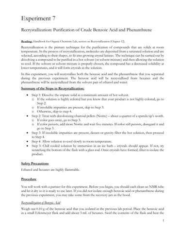 Experiment 7 Recrystallization: Purification of Crude Benzoic Acid and Phenanthrene Reading: Handbook for Organic Chemistry Lab, section on Recrystallization (Chapter 12).