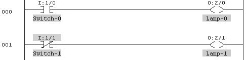 Once you feel comfortable with dragging and dropping, ensure that your program once again looks like the one pictured above. Now download your program to the PLC, and place the PLC into the RUN mode. Toggle both Switch-0 and Switch-1 on and off a number of times, and observe the effects this has on the lamps. Ensure that you are satisfied with the operation of your program before proceeding further.