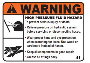 EYE PROTECTION & CARDBOARD: Operators and Maintenance personnel must wear proper eye protection and use cardboard or wood to investigate hydraulic leaks to prevent death or serious injury from being injected with high pressure hydraulic fluid.