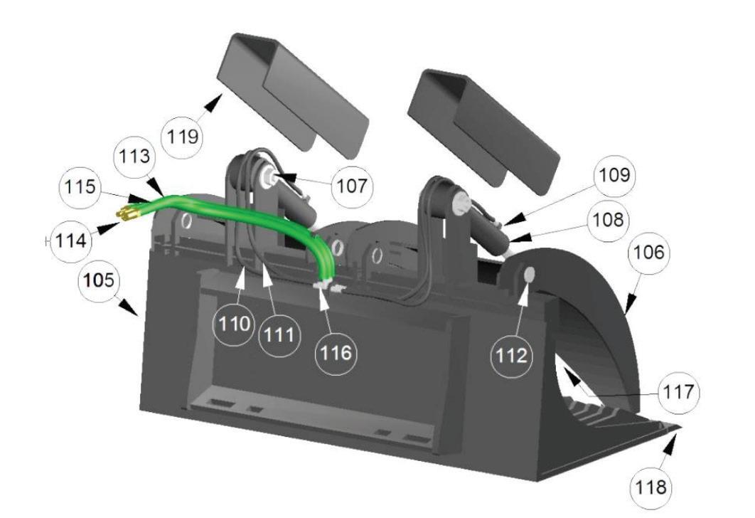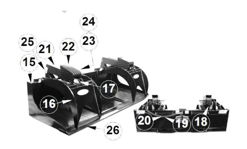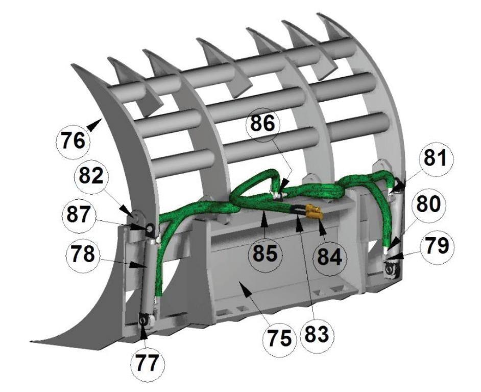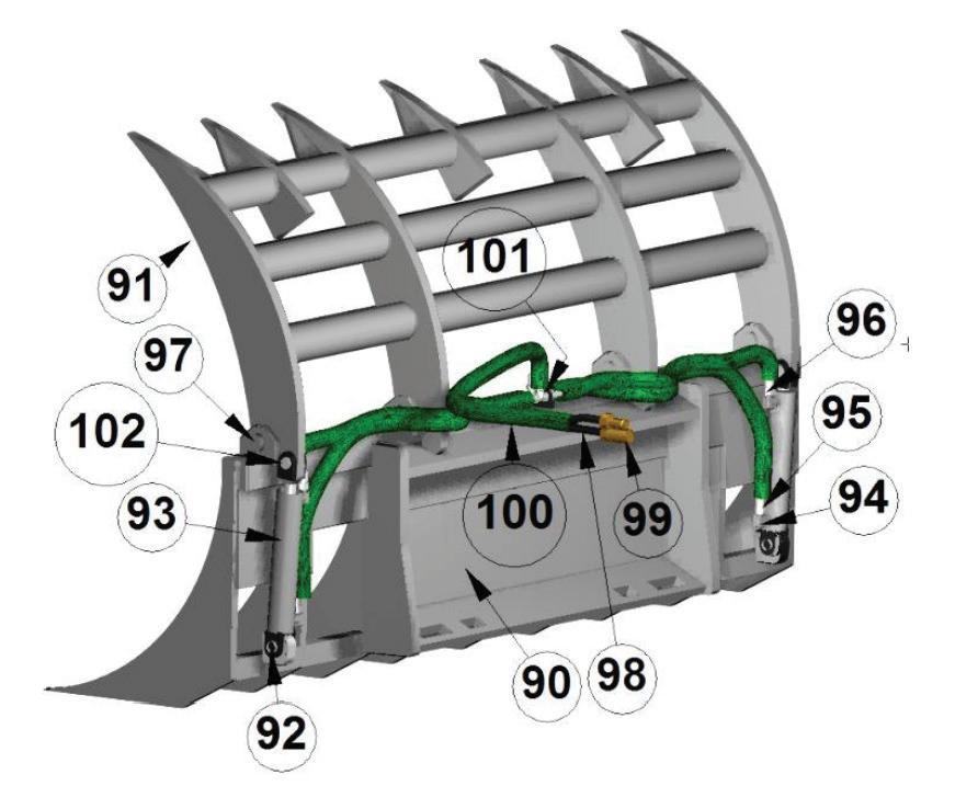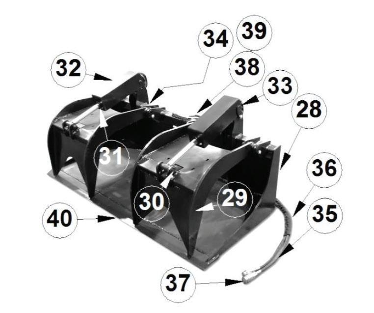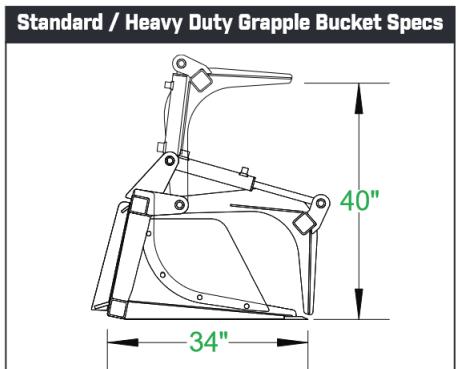 All Grapple Buckets have cylinders, with all hydraulic lines routed inside the tubing to prevent tears. They are also built with top quality steel, oversized points & bushings, with grease fittings at every pivot point. Every unit exceeds the lifting capacity of the skid steer machine it is attached to.
