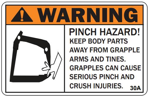 ONLY service the grapple on stable, even terrain. NEVER park on sloped terrain to avoid being struck & killed or seriously injured by the unexpected rolling or movement of the machine.