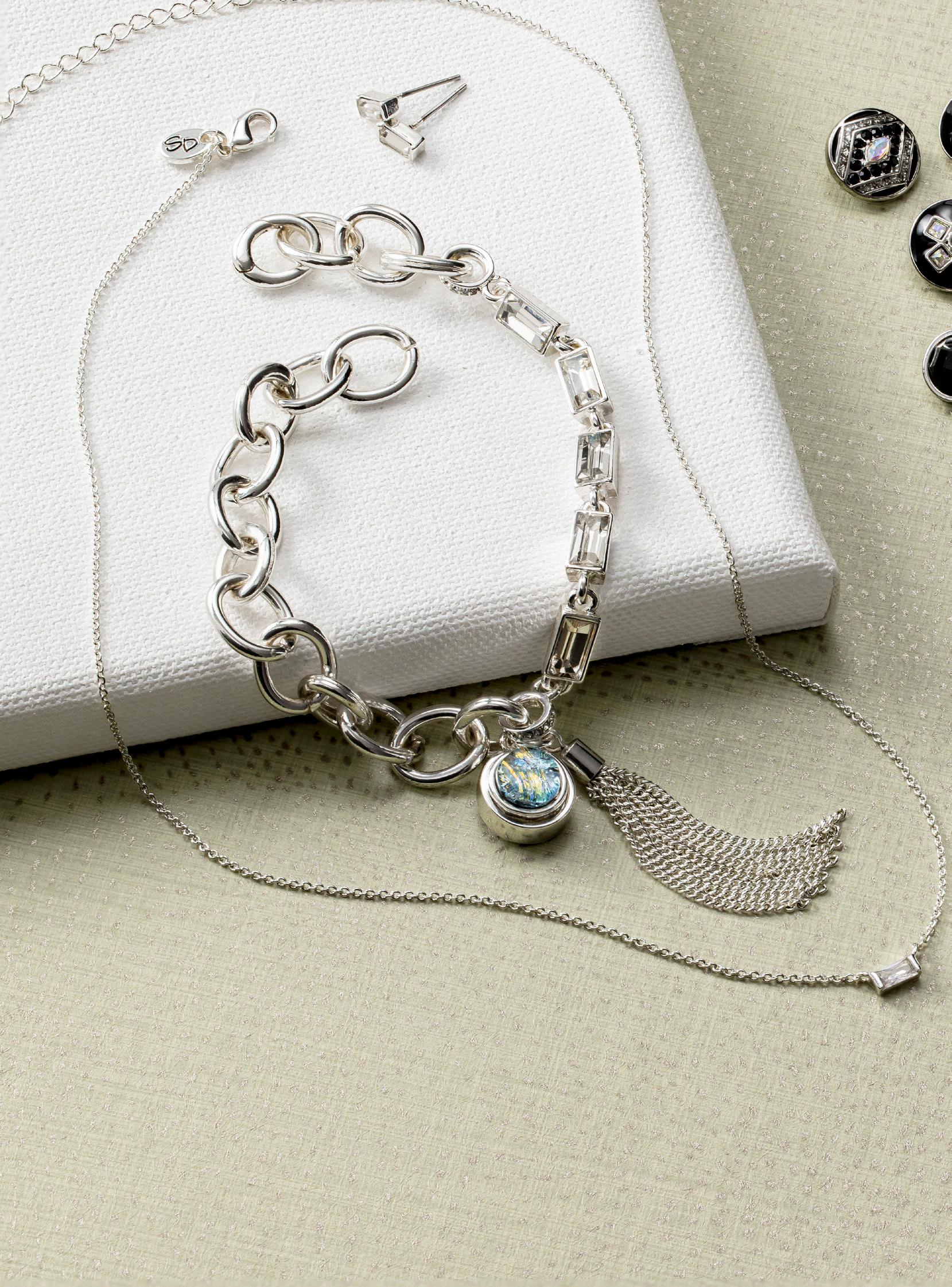 subtle Baguette Earrings GEE0010 - $19.95 .5” Mini Interlinks Bracelet LKB0054 - $44.95 18 Links, 6.25” Interlinks Baguette Bar LKB0065 - $24.95 3” wide Silver Tassels GEA0006 – $16.95 Set of two – 1.5” Length Dotlet Charm CHA5001 - $11.95 .6” Drop Kaleidoscope Dichroic Dotlet MUDG501 - $16.95 Baguette Necklace GEN0011 - $29.95 16” with 3” Extender Black Marquise Original Dot BLDX011 - $14.95 14