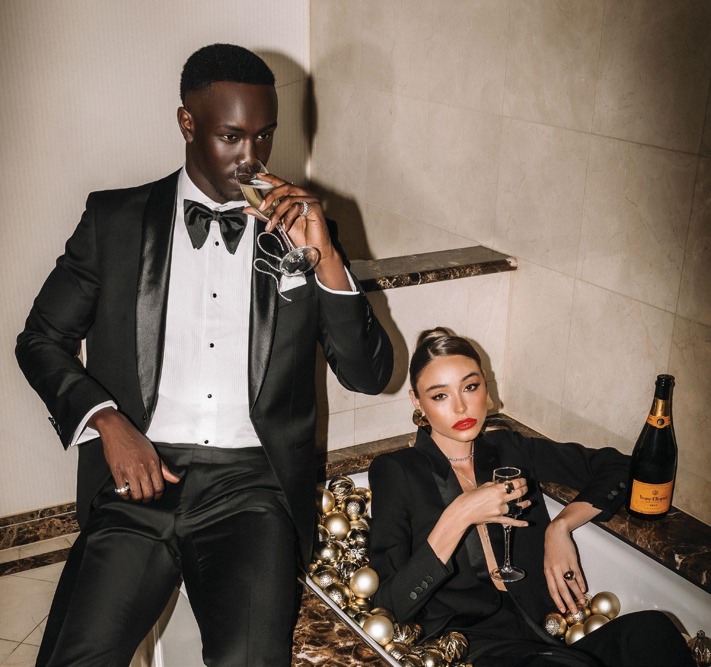 Opposite page: Okello wears Peter Jackson Clooney Twill Tuxedo $699, Peter Jackson Pleated Tuxedo Shirt $125, Peter Jackson Silk Bow Tie $59.95, Zara