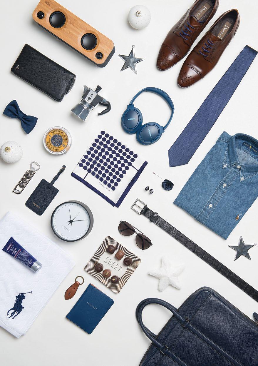 1. CALIBRE Vivienne Westwood passport wallet $299 2. JB HI-FI Marley Get Together mini Bluetooth speaker $199 3. BED BATH N’ TABLE Glass ball with glitter dots $6.95 4. COUNTRY ROAD Noël decoration $9.95 5. AQUILA Hartley shoe $399 6. BROOKS BROTHERS Tie $129 7. POLO RALPH LAUREN Shirt $149 8. JB HI-FI Bose Sound True headphones $249 9. QUATTRO DELI Bialetti espresso maker 1 cup $44.99 10. DÉCLIC Deluxe bow tie $89.95 11. L’OCCITANE Organic Shea Butter 150ml $50 12. RHODES & BECKETT Pocket square $69 13. CHEF KING Golf bottle opener $24.99 14. SHERIDAN Luggage tag $49.95 15. GEORG JENSEN Clock $215 16. SUNGLASS HUT Tom Ford sunglasses (371373) $620 17. CALIBRE New York pin $79 18. HERRINGBONE SYDNEY Monogram cufflinks $158 19. R.M.WILLIAMS Exotic crocodile belt $400 20. BED BATH N’ TABLE Fibre star decoration $7.95 21. HAIGH’S CHOCOLATES $13.40 per 100g 22. WEST ELM Plate $14 23. COACH Metropolitan briefcase $975 24. KIKKI.K Passport holder $39.95 25. POLO RALPH LAUREN Key fob $69 26. DAVID JONES Polo Ralph Lauren hand towel $79.95 27. KIEHL’S Facial Fuel scrub $32