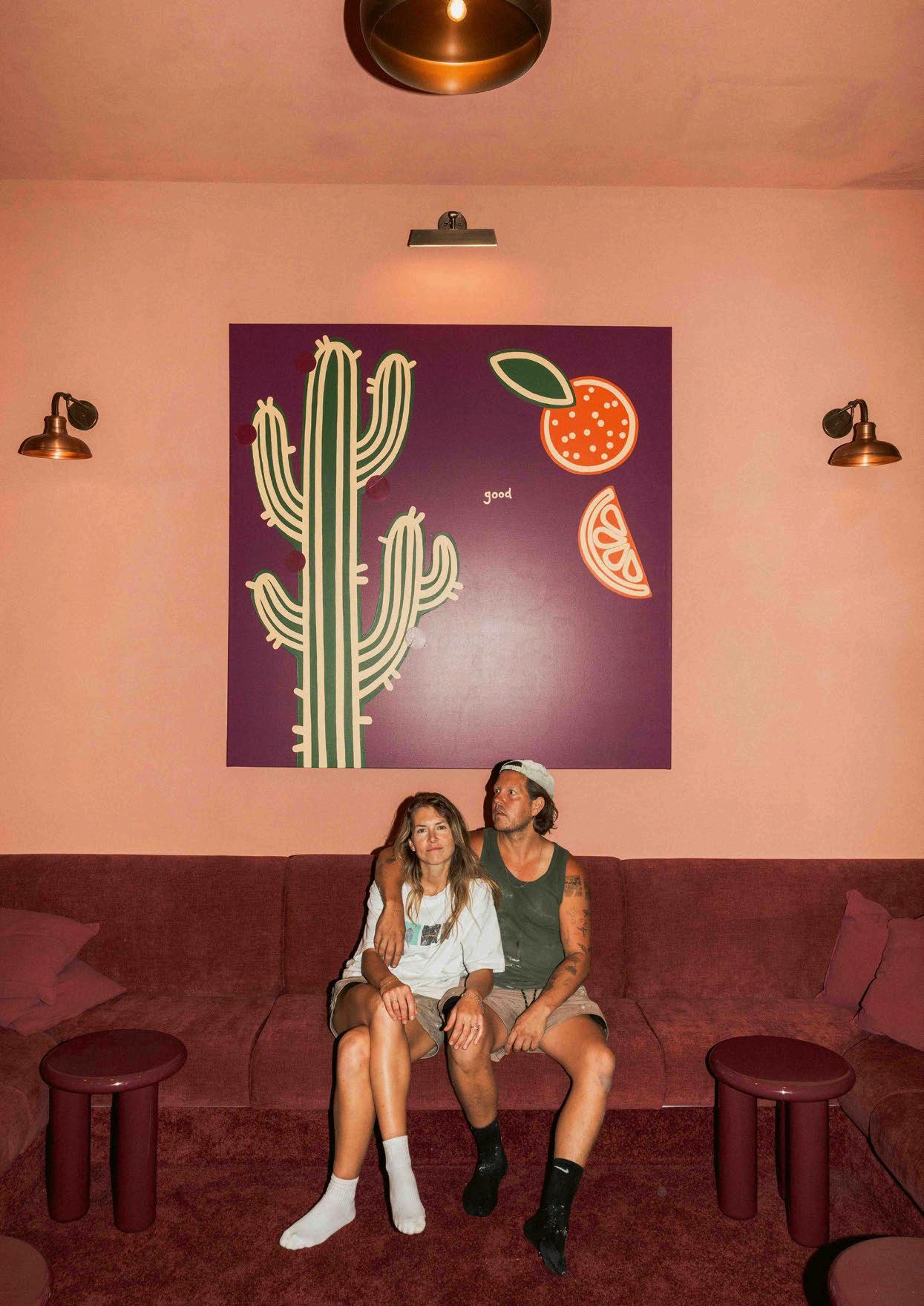 The space is a living diary of their travels, drawing heavily on California’s sun-soaked aesthetic – a place very close to the couple’s hearts. For Coco, it’s long been a source of inspiration, ever since she lived there as a child and developed a love for hotel design. “I’ve always had an affinity for it,” says creative polymath, Coco. “Everything we create kind of feels like a hotel lobby.” Looking at The Raspberry Room – the couple’s quirky, eclectic tattoo studio, which could be plucked straight from a Wes Anderson set – their signature flair for playful and immersive spaces is clear.