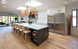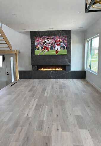 stairwell leading to the lower level tie into the black accents throughout. Water-resistant luxury laminate flooring from Ultimate Flooring was used on the balance of the main floor. Chosen to mimic the look of