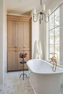 Among the home’s three spacious bedrooms is the carpeted primary bedroom that features a huge walkin closet with custom cabinets from AyA Kitchens, which also supplied cabinetry in the mudroom, kitchen and laundry areas. The closet is hidden behind the 8’ interior door from Springhill Lumber, which supplied all of the interior doors for this project, along with windows and other building materials.