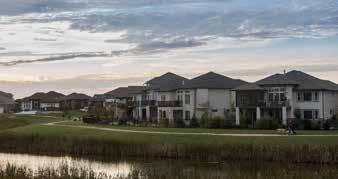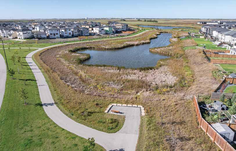 Prairie Pointe features amenities, such as parks and linear pathways along the naturalized lakes. For example, a fiveacre park off Eaglewood Drive sports a green space with a play structure, a picnic shelter and a fire pit, complete with seating. The park also features a new regulation-sized basketball court created with the help of the Winnipeg Minor Basketball Association and installed by the City of Winnipeg.
