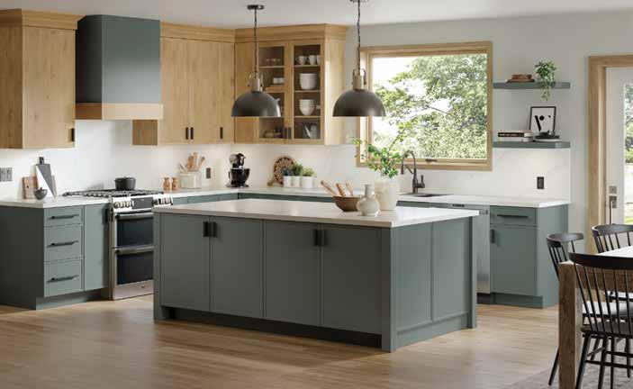 the open layout. It’s paired with the Soho Thermofoil in Woodgrain Flint, adding warmth and balance. Both finishes feature a flat-panel door style that keeps the overall look sleek and streamlined.