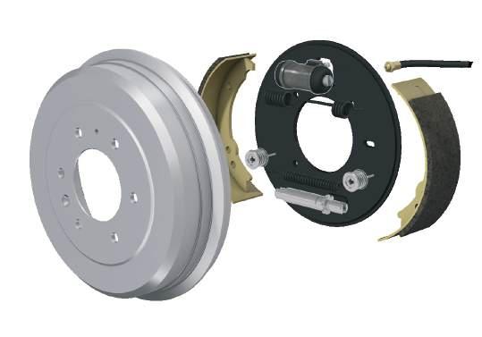 The brake drum, wheel cylinder and brake shoes work together to create the necessary friction to bring the vehicle to a stop. The brake drum is located inside the wheel and houses the brake shoes. The brake shoes are metal arcs with friction material on one side that press against the brake drum when the brakes are applied. The resulting friction slows and stops the vehicle.