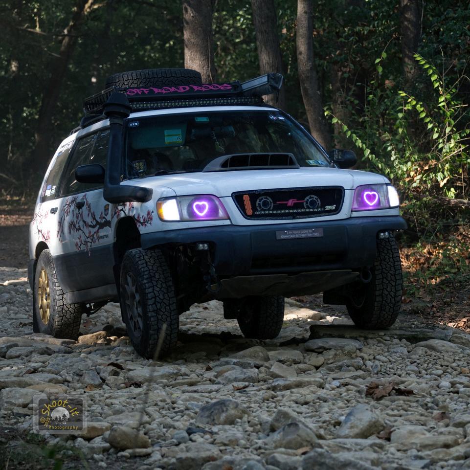 I bought the vehicle about two years ago. I originally planned to lower it and make it a street build, but plans changed and I decided to lift it with a 2” ADF lift. The vehicle is definitely unique, featuring a Spinnywhoosh cherry blossom decal running down the sides and unequal length headers flowing into a 3” WRX/Forester XT exhaust. I’ve had a blast taking it through the Pine Barrens and have plenty of stories to tell about the broken parts that have fallen off — the biggest being my exhaust, which was all caught on video.