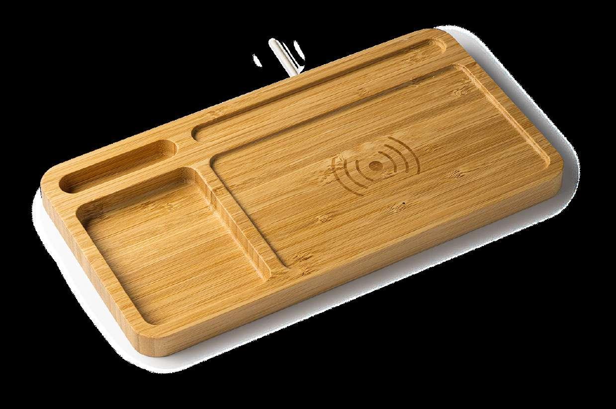 Wireless charger in natural bamboo, in-built on a desk tray. Compatible with wireless technology models. DC5V. White cable included. Presentation in eco design box. 27 x 1,5 x 14,5 cm 1 20