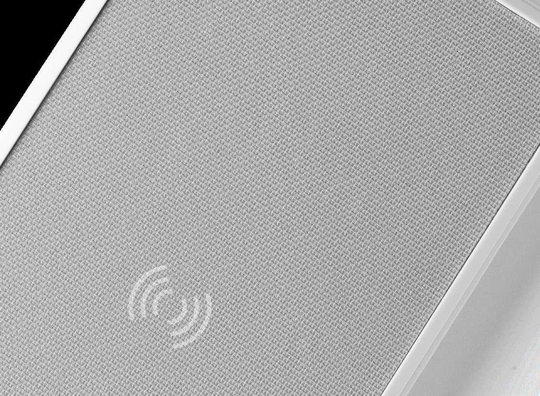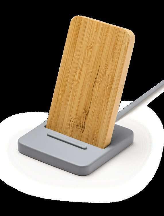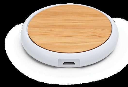Wireless charger with white ABS body and natural bamboo top surface. Place your Smartphone on it and let it charge. Compatible with models with wireless technology. DC5V. Cable included. Presentation in eco design box.