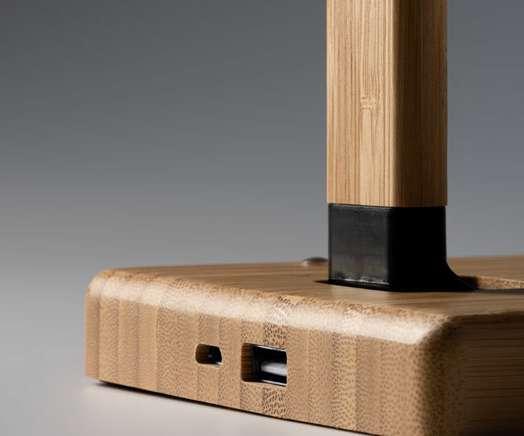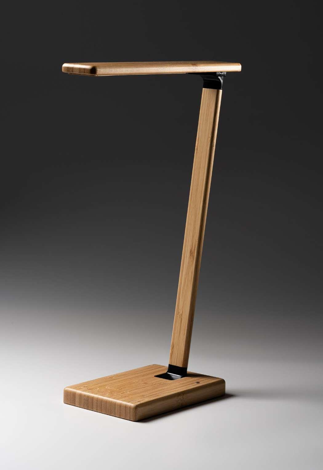 Foldable bamboo table lamp with in-built 10W wireless charger. 25 LED lights with 3 lightning and intensity modes. Light timer from 1 to 2 hours. Presentation in eco design box.