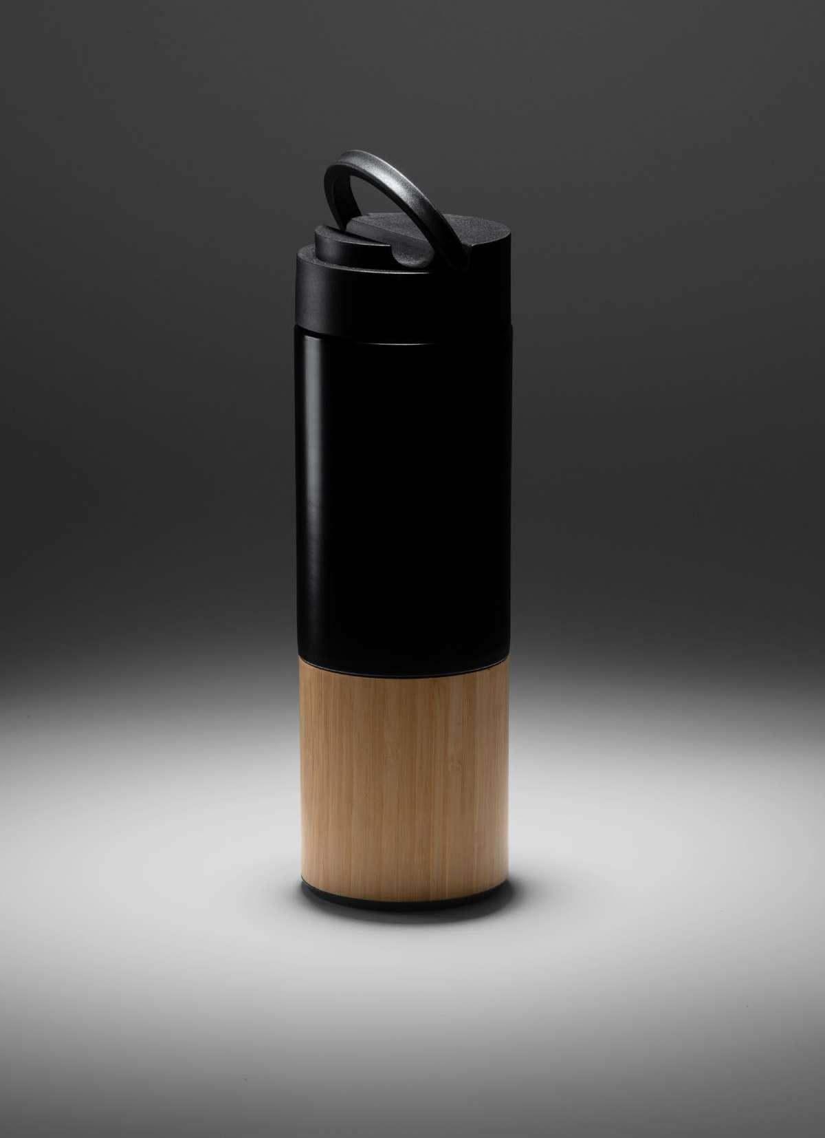 Wireless Bluetooth speaker with ABS body, natural bamboo front and visible cone. Handle in imitation leather included. 3W output. Rechargable battery. Cable included. Presentation in eco design box.