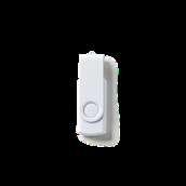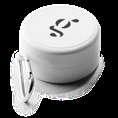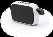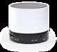 Wireless speaker with white ABS body and natural bamboo. FM radio function, hands-free, Mini SD card slot and 3W output. Rechargeable battery. Cable included. Presentation in eco design box.