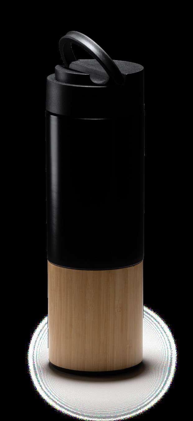 Wireless speaker with main structure in bamboo and elegant carry strap. Hands-free function. 3W output. Rechargable battery. Cable included. Presentation in eco design box.