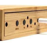 Wireless Bluetooth speaker with main structure in natural bamboo. Features: FM radio, hands-free and Micro SD card slot. 3W output. Rechargable battery. Cable included. Presentation in eco design box.