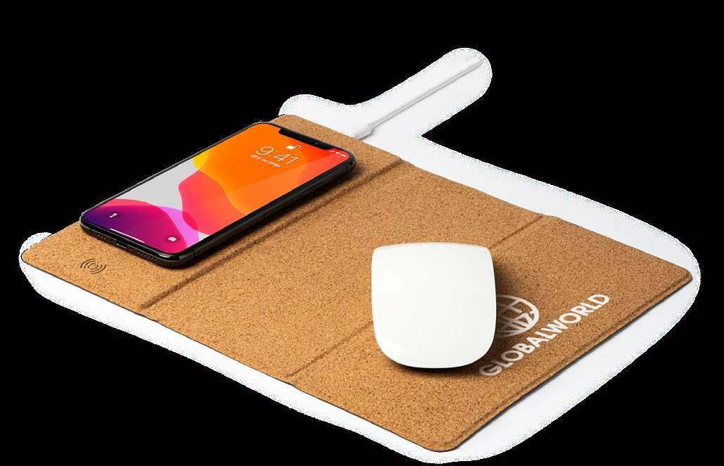 Mouse pad with in-built wireless charger. Soft foldable surface in natural cork with non-slip base. DC5V. Cable included. Presentation in eco design box.