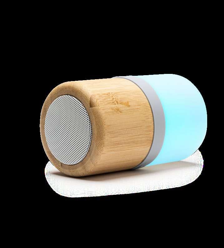 Wireless speaker with main structure in bamboo. Multicolour LED light with 4 lighting modes. 3W output. Rechargable battery and cable included. Presentation in eco design box.
