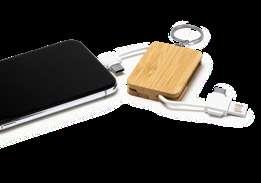 Keyring with 3-in-1 charging cable. Main structure in bamboo. Micro USB, Type C and lightning connection. Presentation in eco bag with window.