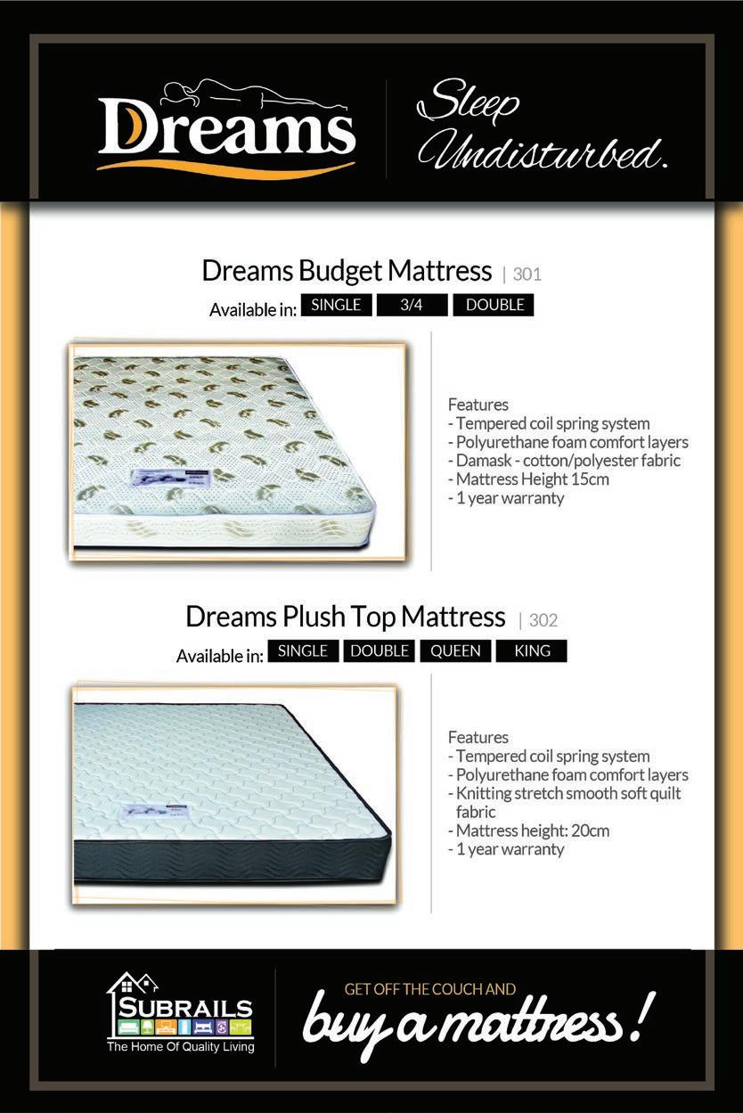 *Photos for Illustration purposes only Fabric color may differ CASH PRICE $899 Nokonoko Queen size Bed with Smooth Top Queen Medium Density Foam Mattress - 6 | 3/4" B024MQ634M (no warranty on mattress) Also Available Nokonoko King Size Bed with Smooth Top King Medium Density Foam Mattress 6 3/4" - B024MK634M (no warranty on mattress) - $999 Also Available *Photos for Illustration purposes only Fabric color may differ. CASH PRICE $629 Dream Dream Double Bed with 5 25" Medium Density Foam Mattress Tape Edge B006525D-TP Dream Single Bed With 5.25" Medium Density Foam Mattress - B006525S - $429 Dream 3/4 Bed With 5 25" Medium Density Foam Mattress B0065253Q - $495 92*Conditions Apply: Errors and ommisions excluded. Fabrice color may differ base on stock availibility.Some items may not be on display at all locations but are available for sale on request. Prices valid until stocks lasts. All Hire Purchase Applications are subject to our credit approval criteria, including deposit that may be required & re-payment method on application assessment.