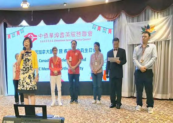 首先主持人帶領大家起立,唱加拿大國歌。嘉賓 輪流發表講話,祝願大家國慶快樂,並感謝各位多年 來對中僑互助會的支持,以及呼籲各位積極參加即將 在7月14日在史丹利公園舉行的中僑百萬行活動。期 間還有一項特殊事宜,是為近日去世的優秀義工譚佐 治(Geroge Tam)默哀一分鐘。Geroge常年服務於華 埠耆英社群,做免費的英文老師,受到大家的尊敬和 喜愛。之後,嘉賓一同切蛋糕分享給大家,慶祝加拿 大國慶生日。
