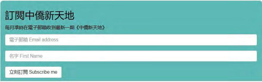 出版:中僑互助會 編輯:李育嬌、中僑新天地編輯委員 名譽顧問:劉國藩、葉吳美琪、黃展斌 執行編輯:陳華英、黎國豪