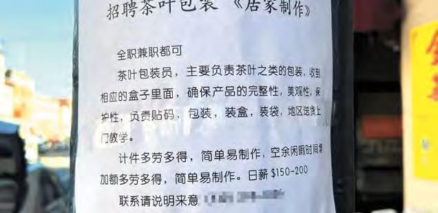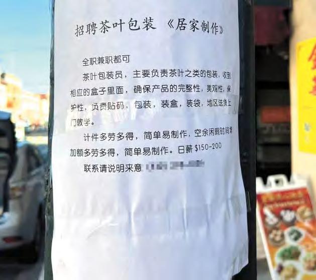 多元文化是大溫地區的「城市性 格」,華埠、列治文、本拿比麗晶廣 場等很多地方都是華人聚居的熱鬧地 區。近年來相信很多讀者都有看到, 電線桿上貼滿了花花綠綠的廣告信 息,最近尤其很多中文廣告打出「高 薪招聘」的名頭,其中內容以招聘住 家保姆、管家、廚師等崗位為主,還 有別出心裁的酒窖管理員、中老年試 衣模特、茶葉包裝工等等。