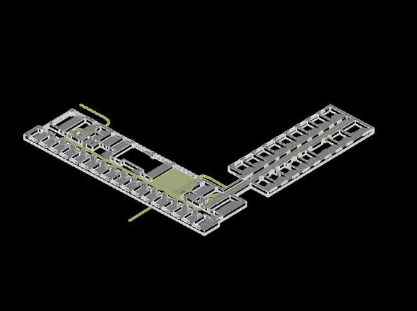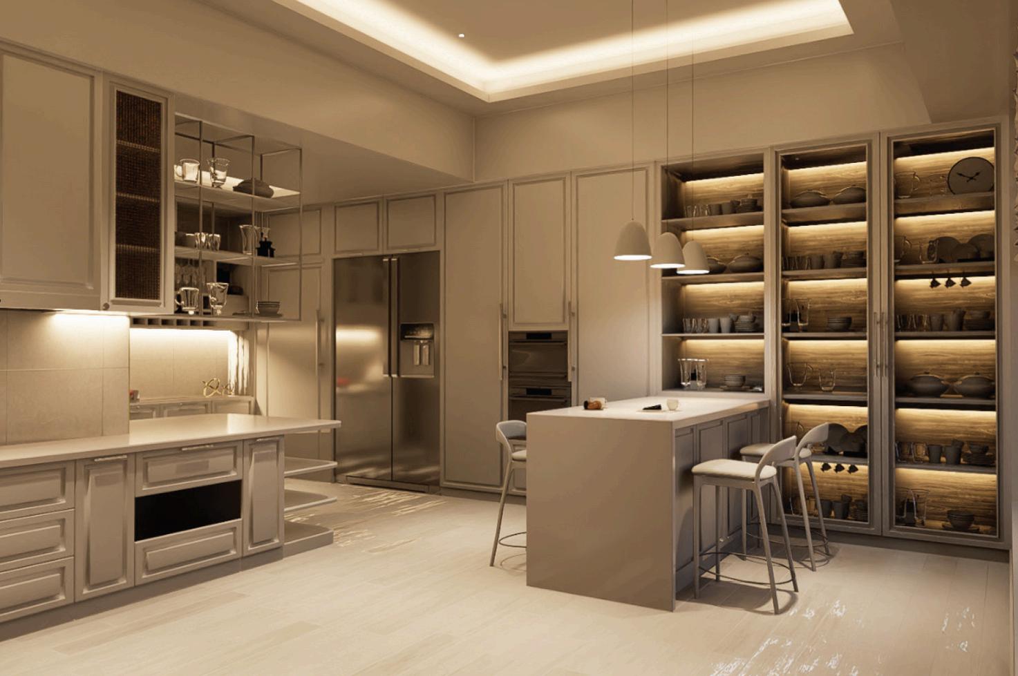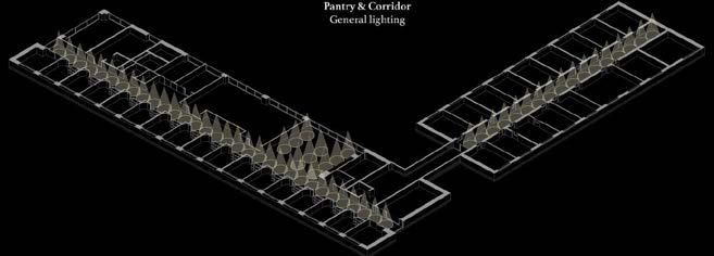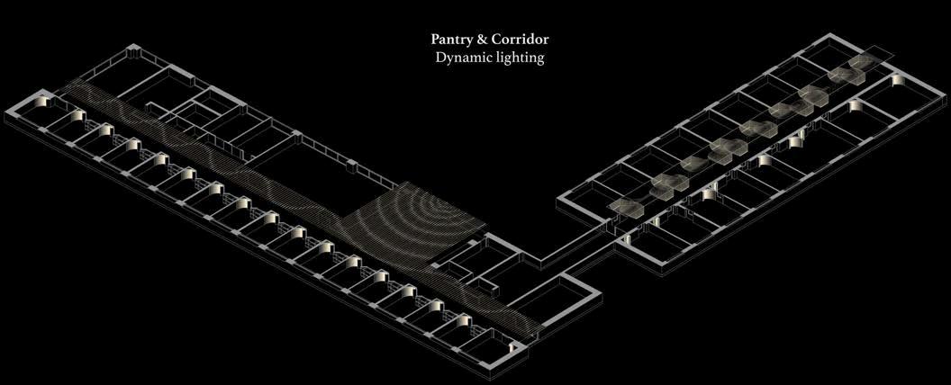 Perspective view of the transition tide scenario, where the DMX-controlled lights create a wave ripple effect from the pantry to the corridor and offices, reminding users of the time for break.