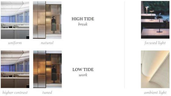 Dynamic lighting incorporated with inspiration from ‘tidal wave’ will retain the excitement of the same ‘office-looking space’ throughout the year to keep the employees active. Lighting is predominantly also a tool for communicating the office hours of the day ( time for fika, time for lunch, time for work ).
