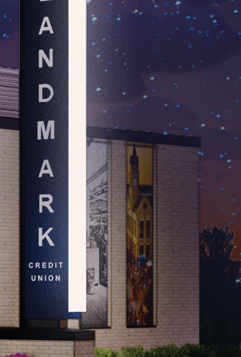 To reinforce local identity, we incorporated Oconomowoc-specific elements into the branch’s design. This included designing exterior wall slots to display graphics of local landmarks, a feature intended for both this and future branches. Additionally, we re-imagined Landmark’s building signage as an abstracted modern “Lighthouse” mounted on an I-beam, with internally lit elements to enhance visibility at night.