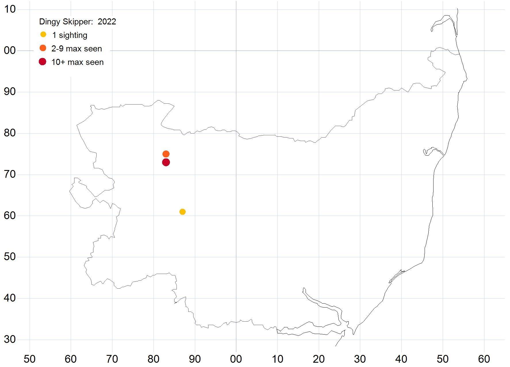 Suffolk’s four species can be split into grassland Skippers and Woodland/Downland Skippers. The Dingy Skipper is our only representative of this second group and in Suffolk is a woodland specialist. It is a BAP Priority species but appears to be stabilising nationally. Locally, it is at great risk of extinction due to being restricted to only a couple of tetrads in the King’s Forest. The exact locations vary over time due to Forestry England works and cleared areas are often colonised within a year or two. In 2022 a survey was carried out and 71 were counted by Trevor Goodfellow on 14 May. This suggests the species is holding on, but the situation is always precarious due to the shortage of breeding areas.