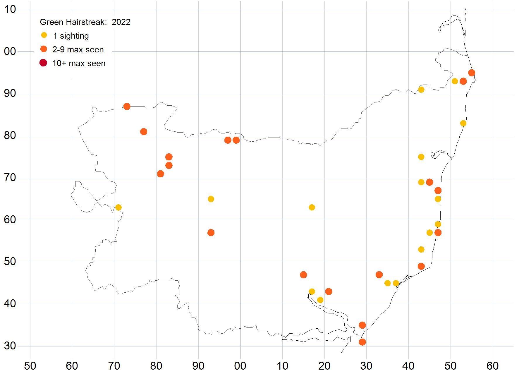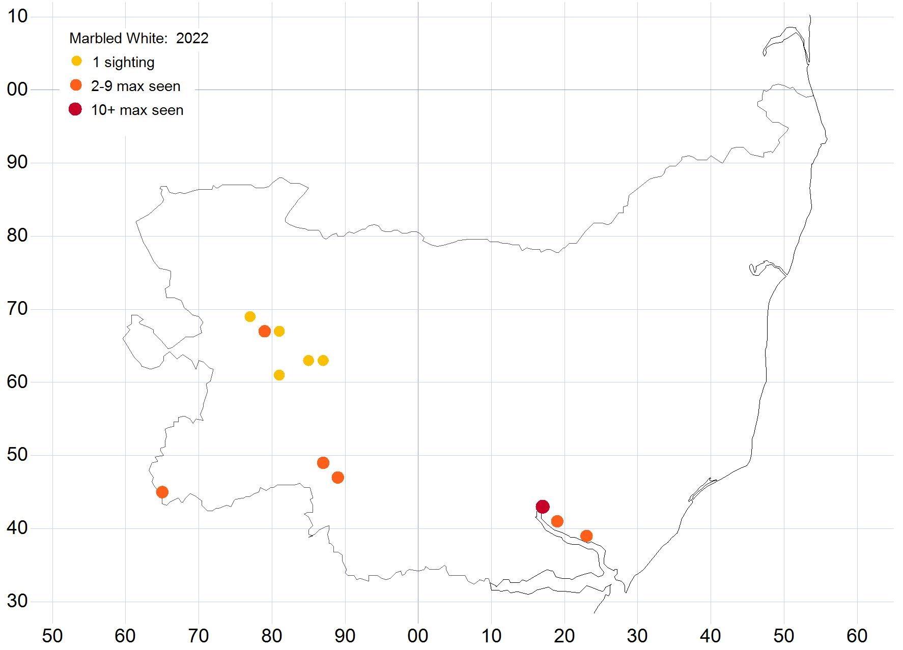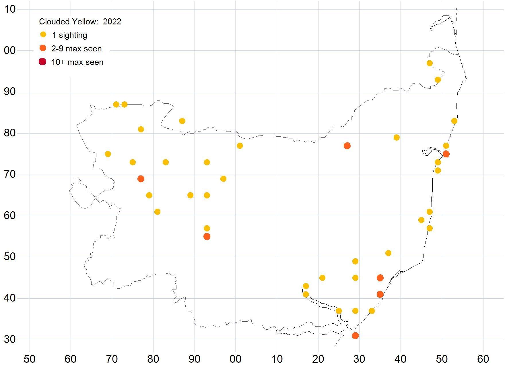 The Brimstone is our only native Yellow and, while single brooded, the adults are so long-lived that they can still be on the wing when their offspring take their maiden flight. This means there is a continuity of sightings throughout the warmer months but with a maximum in the spring months. The benefits of the Buckthorn Project may slowly be materialising, with a few extra sightings in the east of the county. No Pale Clouded Yellow were reported. These would be rarities even in south coast counties and even more so further north and east. The usual number of Clouded Yellow were reported, initially on the coast but the speed at which these individuals sometimes vanished would suggest that their migratory instincts were still strong and that they continued inland. Quite a few sightings came from the west of the county where they found suitable habitat to nectar and breed in. Some stayed on in coastal locations for several days.