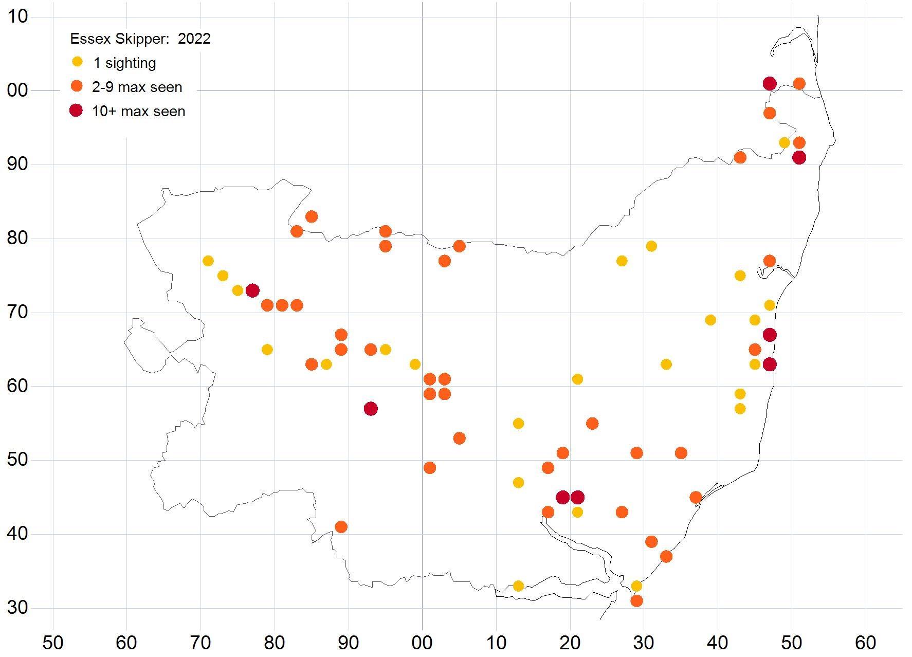 Our grassland Skippers are undoubtedly under-recorded due to the difficulty in separating Essex and Small Skipper in the field. Both seem to be county-wide and have stable populations. The no-mow theme is beneficial to these species and the Large Skipper as long as some grass is left standing year long. Where grass is cut e.g, with an end of summer cut, Skipper eggs (Essex Skipper) and larvae (Large and Small Skipper) which are higher up the grass stem perish. Skippers are then noticeably less abundant than Brown butterfly species whose larvae will be at the base of grass plants and less at risk of mowing.