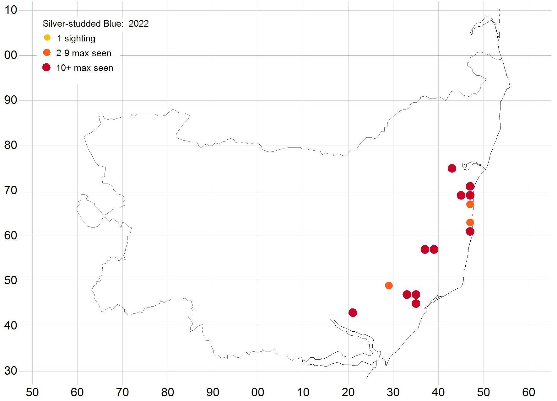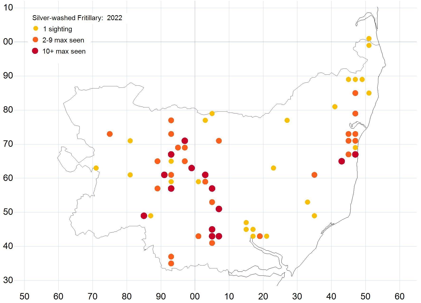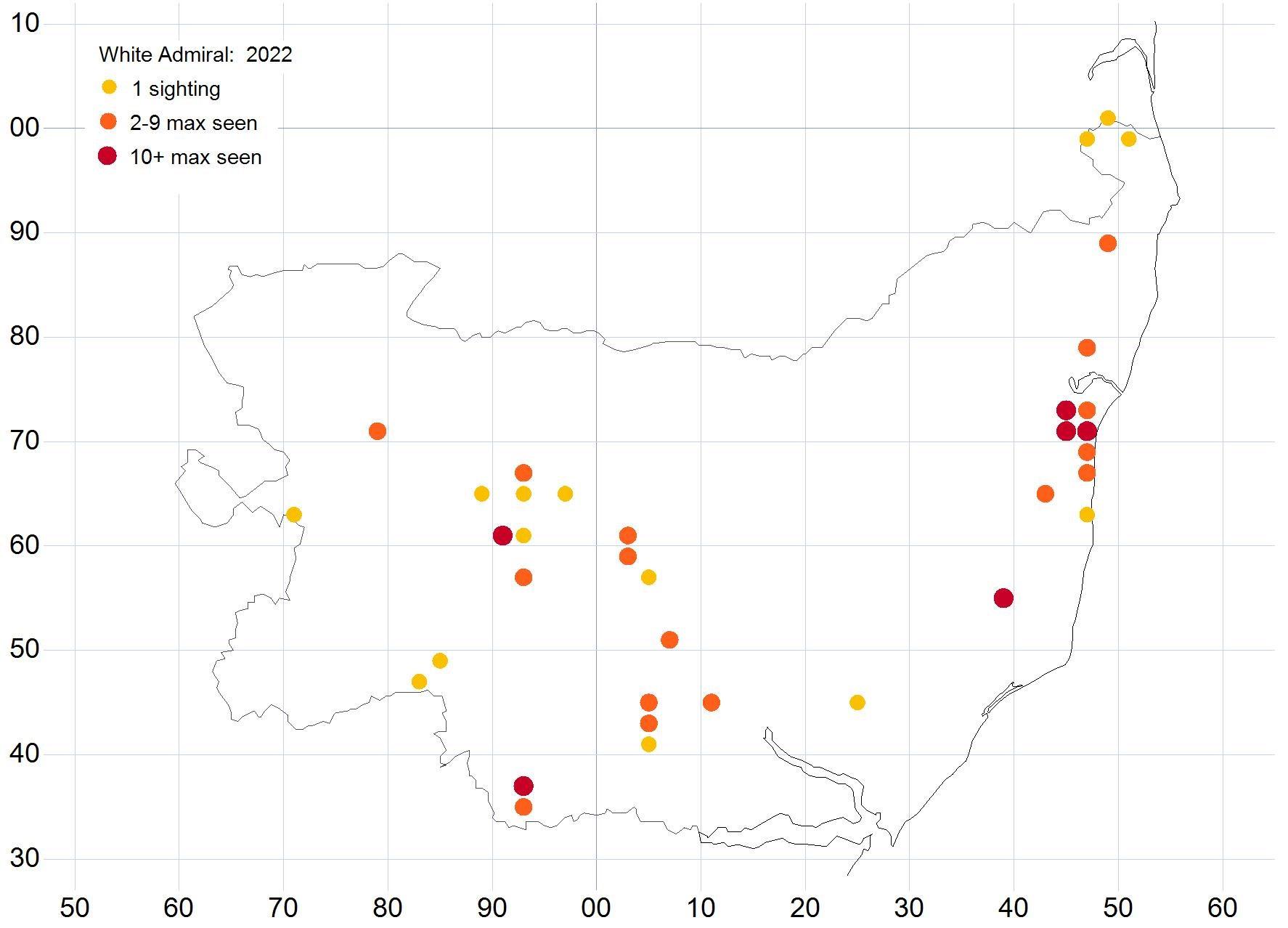 Silver-washed Fritillary had one of their best years with dozens of adults seen flying along transect routes in Minsmere and it was a similar scenario in many of our larger and more mature woods. White Admiral also had a good season and often came down to nectar on bramble and other flowers in glades. During the hottest spells, adults were observed aestivating in hazel and other trees, occasionally joined by Grayling. White Admiral is another species which may suffer from the drought. It hibernates as a third instar larva, but many honeysuckle plants were withered and dead-looking until late summer or even autumn far from perfect for a small caterpillar. This is a Biodiversity Action Plan (BAP) species for Suffolk, and I wait with cautious optimism to see if the 2023 season is a good one (historically it has been cold winter and spring weather which has been linked to low numbers).