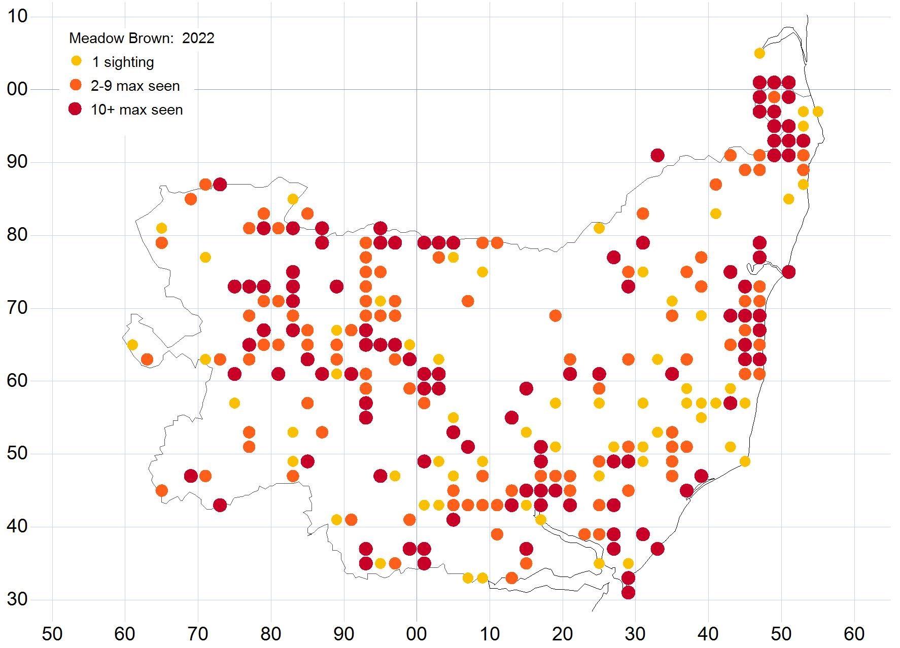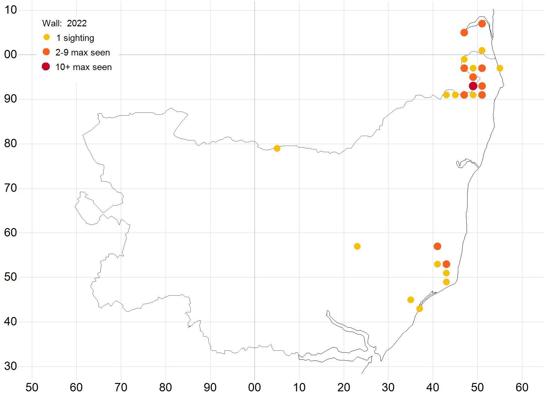 If the drought affected many species, then it is the Brown butterflies which were affected most. Many grasslands were devoid of butterflies during the heatwave, as observed by those of us eccentrics who ventured out in it. Some would aestivate during the heat of the day, but others were found in woodland habitats flying and even breeding in shaded glades alongside the regular Speckled Wood. The lack of green grassland was a concern for many Brown butterflies. Larval survival rates could be very low for those species which need to feed before the onset of winter, either in parched grassland or in less suitable habitat. The presence of marshland, wet woodland and riverside habitat in our county did provide some good breeding sites and a base from which to expand from should there be a population decline. One species which appears to have at least survived the drought, if not thrived, is the Wall Brown. This is a Suffolk BAP species and nationally listed as Endangered with a 70% decrease in distribution 2010-2019. It emerged early in 2022 in its strongholds around Somerleyton, Carlton Colville and also Lound and Sudbourne, then went on to produce a very strong second generation. Some of its success may be due to the fact that these low-lying marshland areas did not dry out completely. Additionally, the third generation was very small, and offspring from this generation have been found to have much higher mortality rates than those of the first and second generations, so the short-term future of this species is encouraging. The species is being closely monitored by Robert Quadling, one of our Species Champions (Wall) and he has provided high quality data on a regular basis for this species.