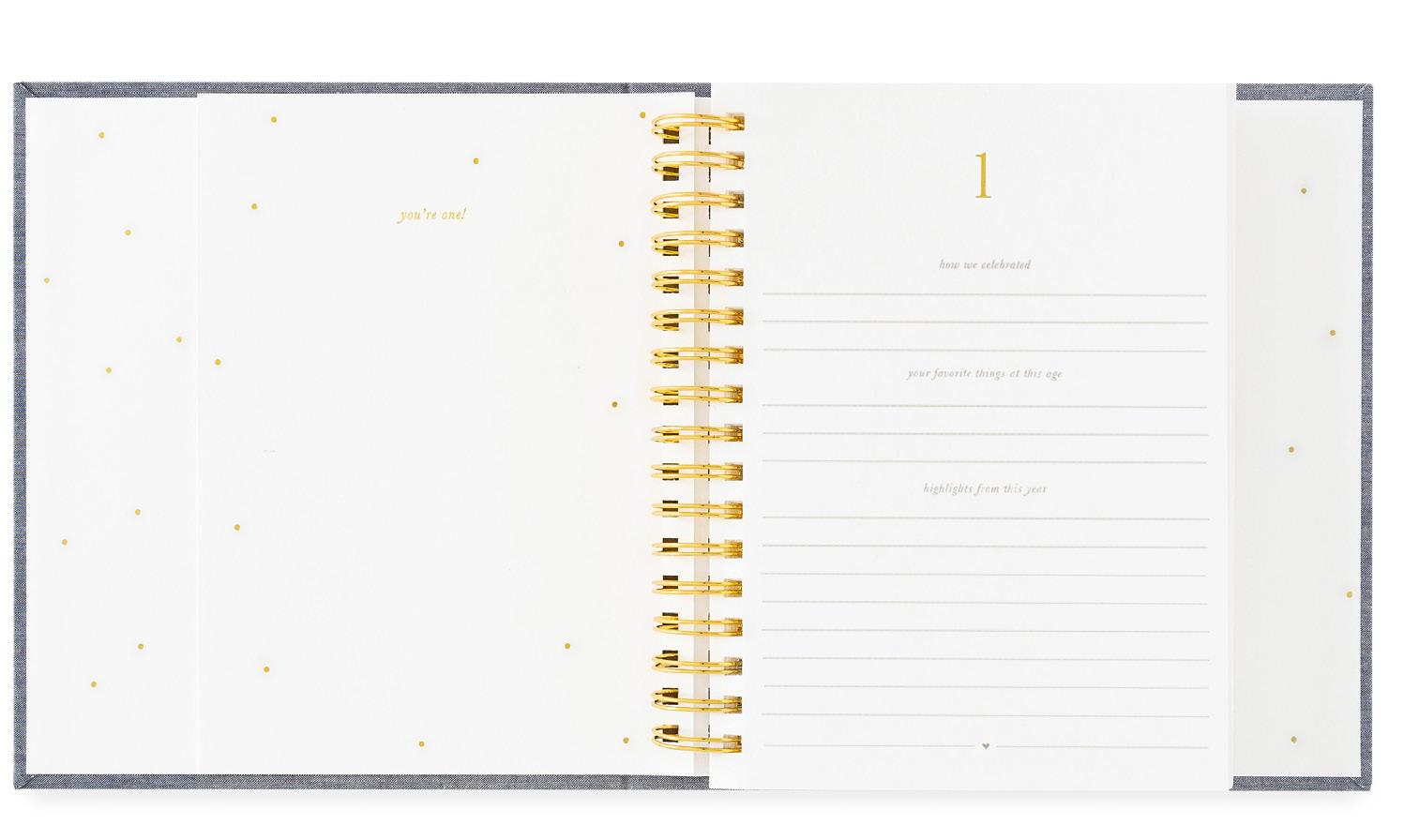 8.25 x 9.50 INCHES, 54 PAGES, CONCEALED GOLD SPIRAL BINDING, KEEPSAKE GIFT BOX, GUIDED PROMPTS FROM 1-13 YEARS OF AGE WITH ROOM FOR PHOTOS AND INCLUDES ADHESIVE